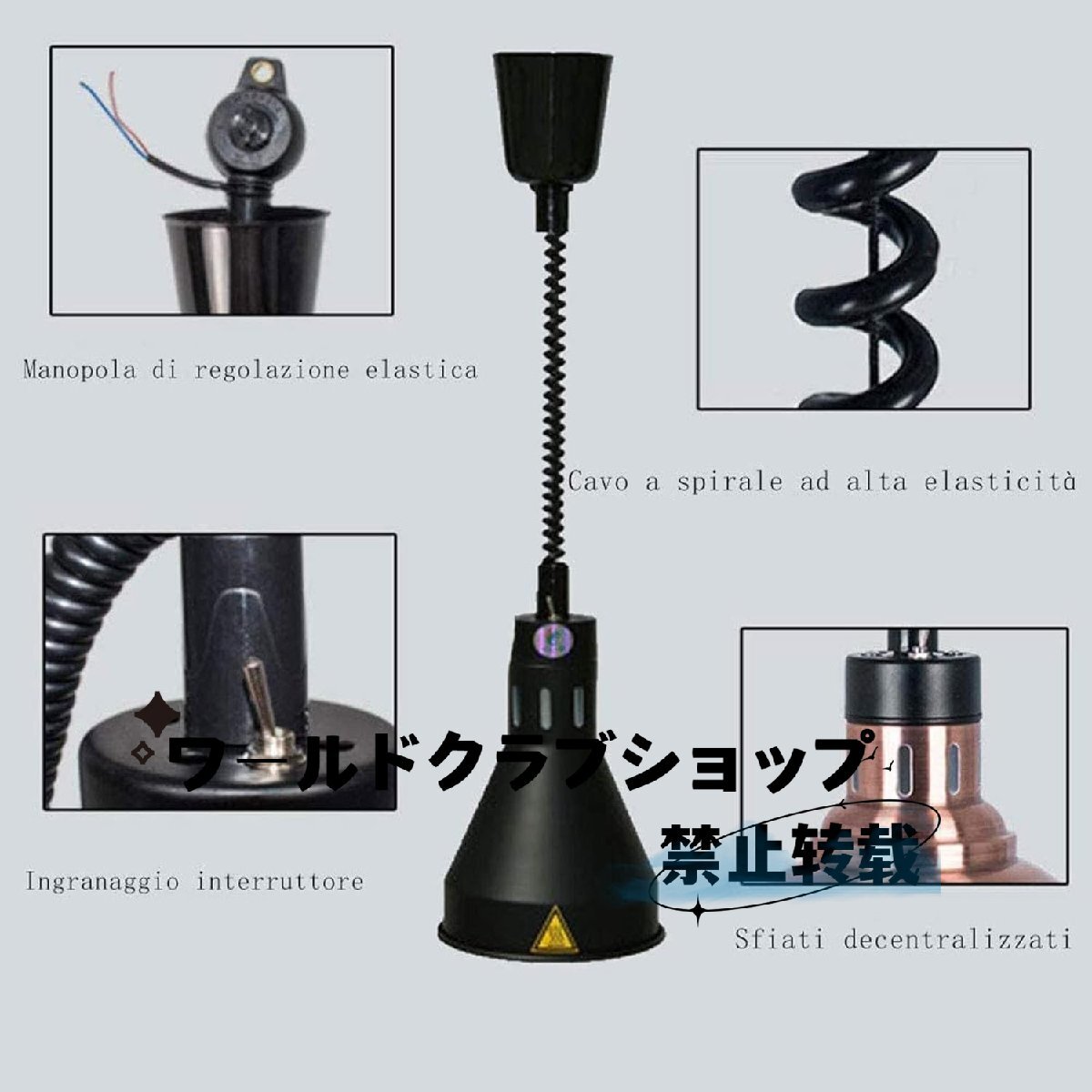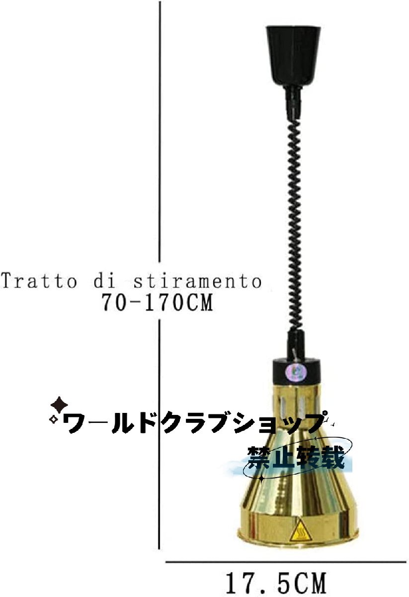 特徴: 1.この食品加熱ランプは、食品の味を美味しく適切な温度に保つだけでなく、食品をより新鮮で美味しく見せ、人々の食欲を高めます 2.均一な加熱、優れた食品断熱効果。 3.高さ調節可能(60~180cm)で食品の過度の乾燥を防ぎます 4.頑丈で耐久性のある金属製のランプシェード。 5.業務用ヒートランプフードウォーマーは、カフェテリア、ホテル、レストラン、学校のカフェテリア、慈善活動、会社などに最適です。 仕様: 製品名: 食品用加熱ランプ 材質:鉄合金 定格電圧:110V~220V 定格電力:250W ノート! 1.ご購入前に商品のサイズをご確認ください。 2. 安全性と信頼性を確保するため。