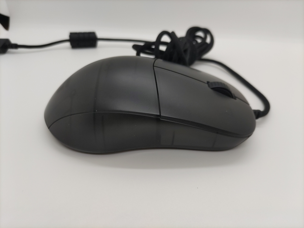 艶消しのダーク系スケルトン素材です。目立つものではありませんが、肉眼ですと左右クリックボタンに使用による艶が見られます。その他、小傷がございますのでご了承ください。