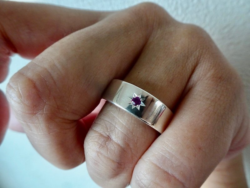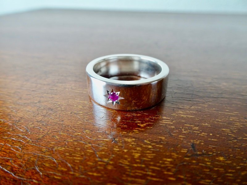 | ■ ■ 商品名: 『一つ星2.5mmルビー、幅7mm、平打リング』 ■ ■ |
