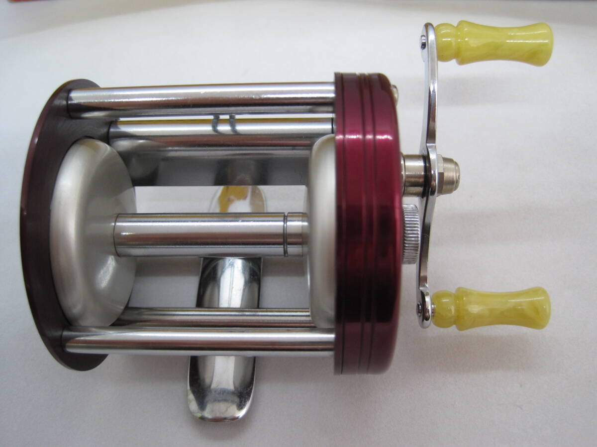 - ワインレッドのアルマイト塗装されたサイドプレートとスプールはアルミ製で、フートやピラー等、めっきされたパーツは真鍮製です。