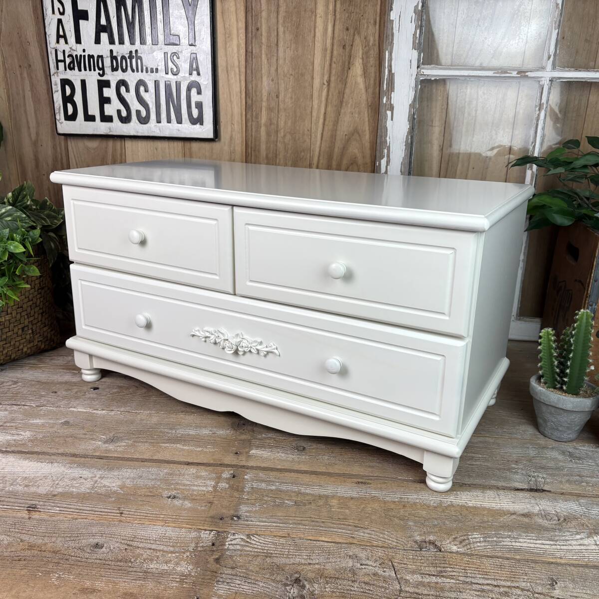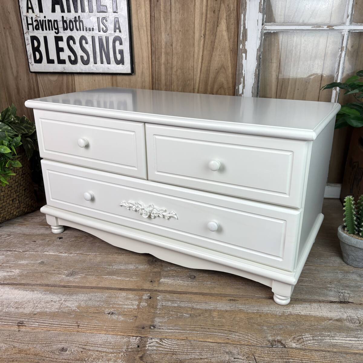 ◆◇商品詳細◇◆ フレンチチェスト横長 フレンチアンティークデザインのカントリー家具です!材質は木製でわりと、重厚感がある豪華なチェストです。引き出し、引き戸が収納力抜群で、洋服ダンス、キッチン収納、インテリア飾り台、ダイニング収納と用途は様々!温かみのあるホワイトがフローリングの洋室などによく合いますよ♪姫系バラ柄デザインもレトロで素敵なデザインですね。今人気の足高チェストでお部屋に置くだけで室内の雰囲気アップにも役立ちます!存在感があるのにシンプルでシックな大人インテリアに最適です!また、カフェインテリア、雑貨屋のディスプレイ、ショップの飾りつけにも役立ちそうな家具ですね。この機会に是非どうぞ♪ 【商品状態説明】 小キズあり、まずまずの美品。 完成品になります。 【サイズ】 横幅:75㎝ 奥行:35cm 高さ:40㎝ 引き出し内寸小約:32cm×29cm×11cm 引き出し内寸大約:67cm×29cm×11cm 【素材】 ウッド(MDF) ウレタン塗装 【カラー】 アンティークホワイト 【完品参考価格】 ¥19,000 | ◆◇発送方法◇◆ ●送料は基本無料ですが、沖縄・離島などにお住まいの方はご負担ください。 (沖縄・離島の方はメールにてご連絡いただければ、送料をお知らせいたします。) ●ヤマト運輸・佐川急便・福山通運大型便のいずれかにて配送いたします。 (運送会社の指定はできません。ご了承ください。) ●日時・時間指定のある方や、お問い合わせ(追跡)番号をご希望の方は取引連絡の際にお知らせください。 | |