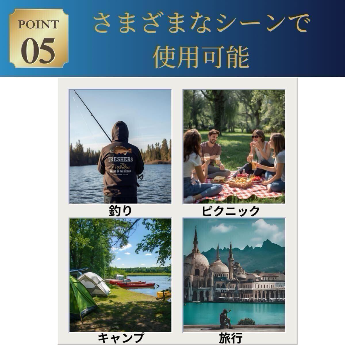 キャンプ/釣り/登山/ピクニック/運動会/フェス/バーベキュー/旅行/屋外イベントなど、