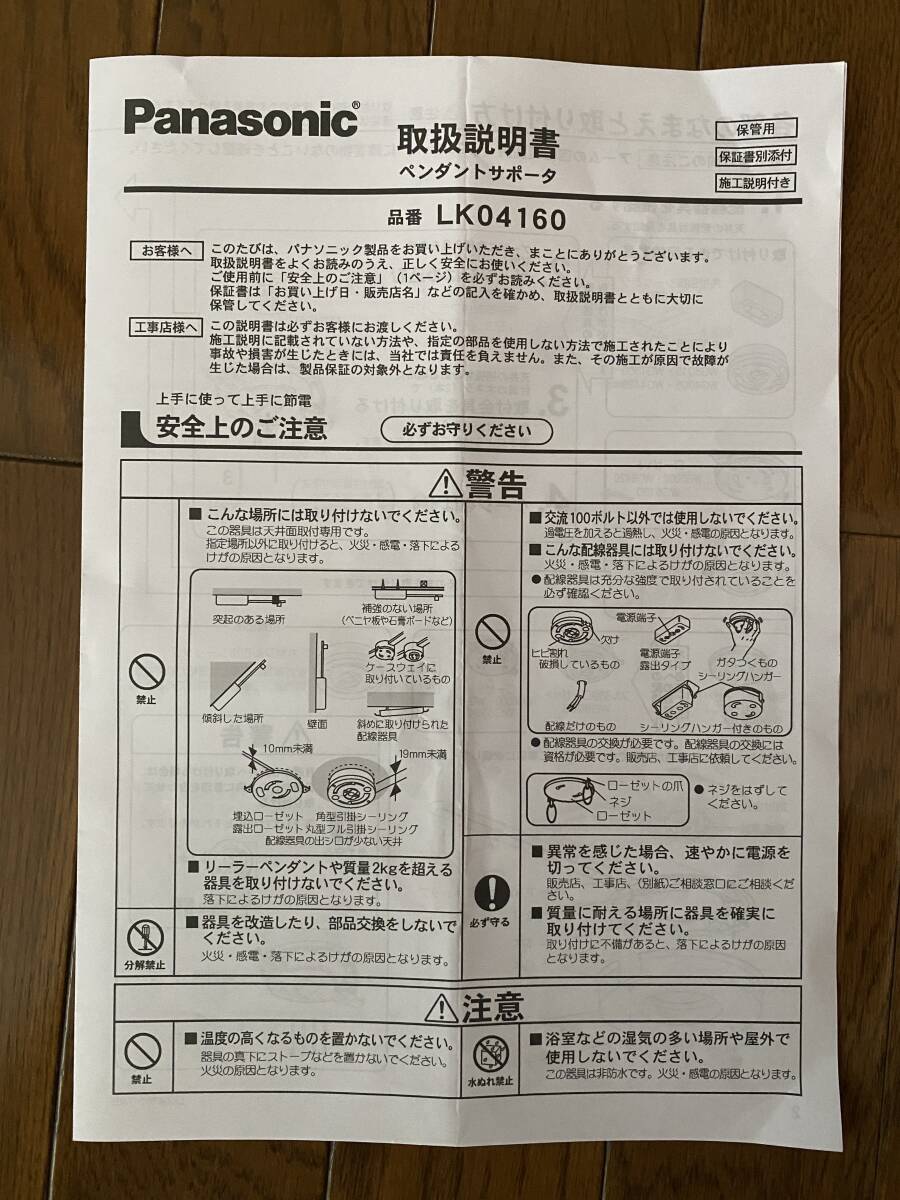 天井に直接フックを付ける場合、失敗することができませんが、ペンダントサポータなら設置後微調整が可能です。天井に穴を開けたくない、または賃貸でフックを取り付けられない方に便利な商品です。