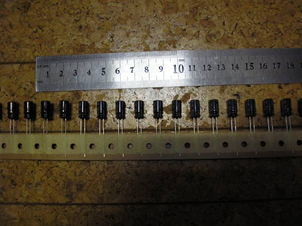 ニチコンのスイッチング電源用高周波低インピーダンスPJシリーズ電解コンデンサ16V100μFを30本です。105℃品、φ6.3mm,高さ11mmです。
