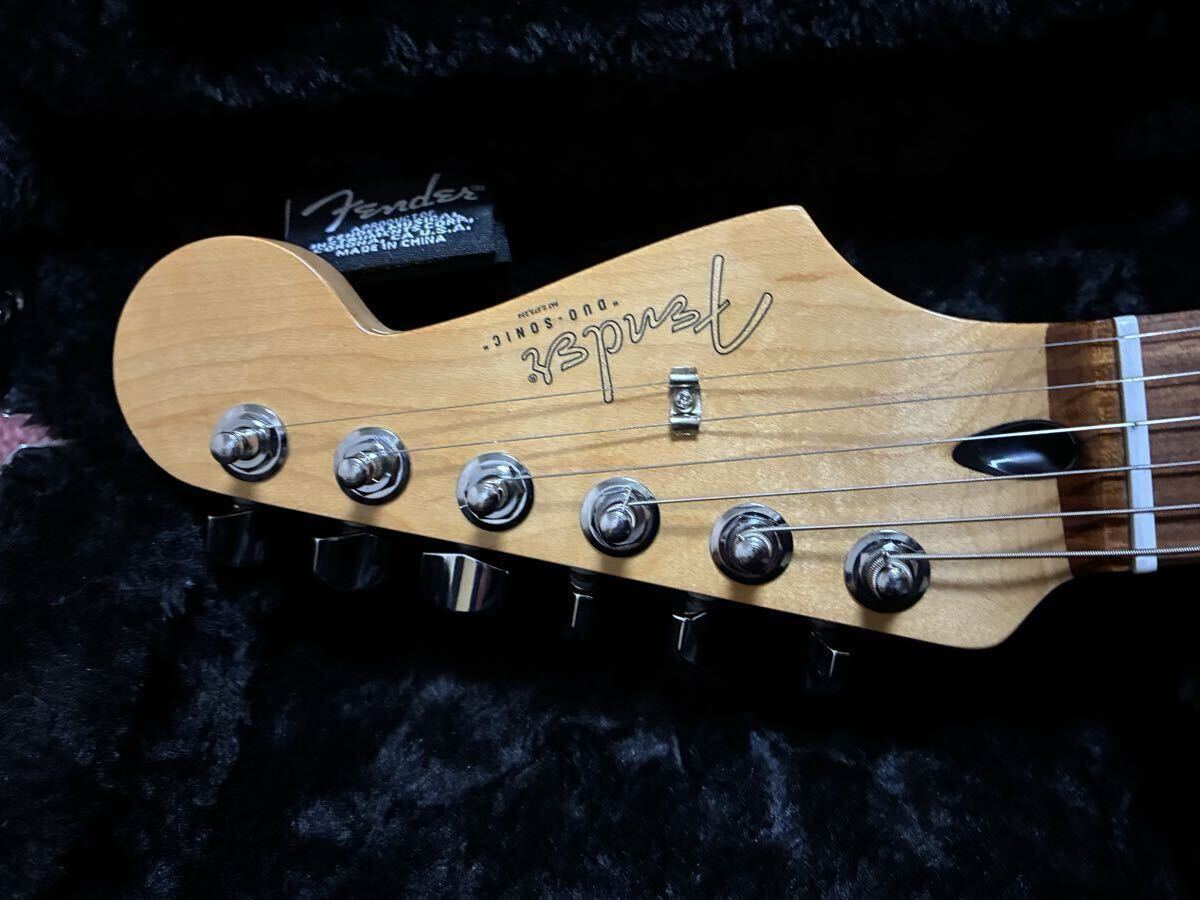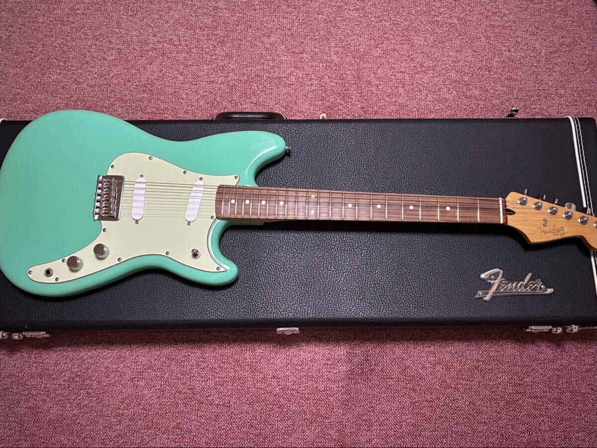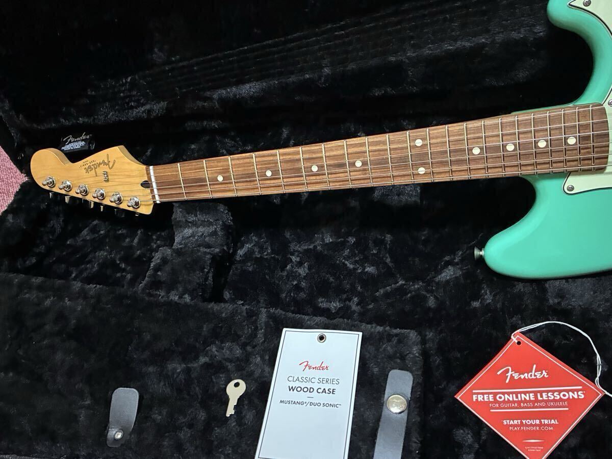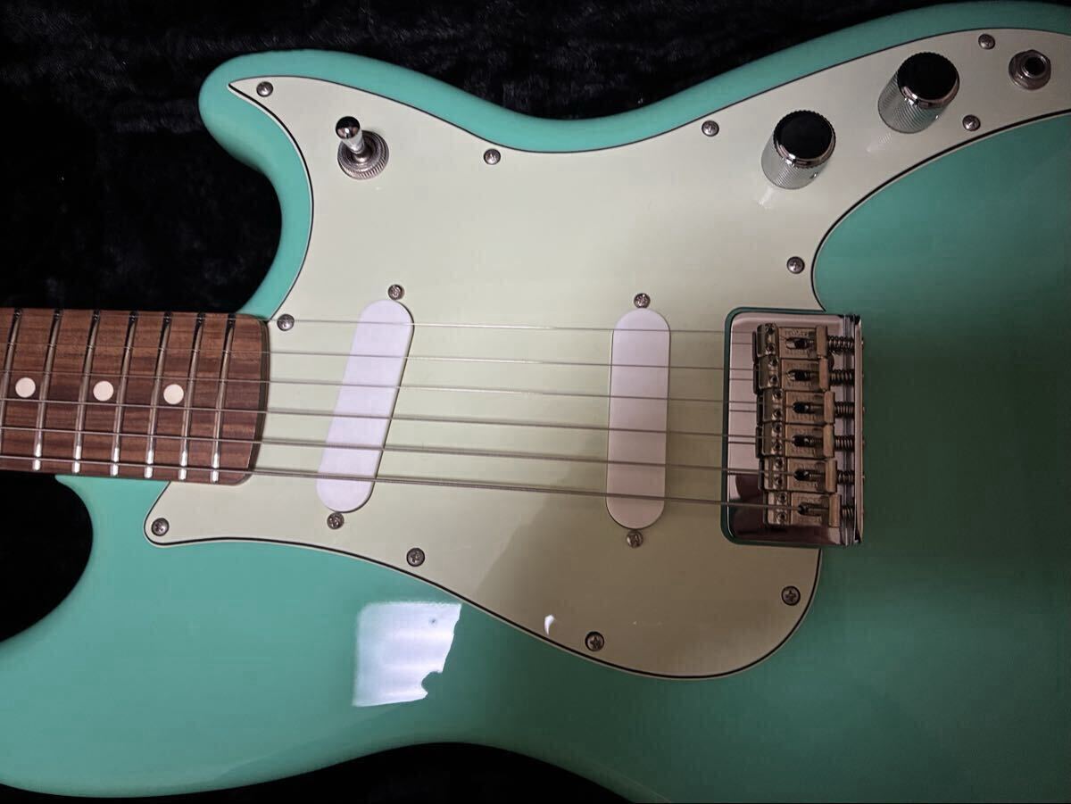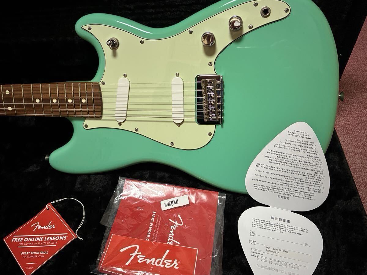Fender Player Duo Sonic 2021年製です。 大切に保管していたため、目立った傷や汚れ、使用感はございません。ネックはほぼストレート、トラスロッドは両方向余裕あり。 フレット残9割、弦高は12フレットで6弦約2mm、1弦1.7mmです。 【ブランド】Fender 【カテゴリ】エレキギター 【商品の状態】目立った傷や汚れなし 【カラー】Seafoam Green 【素材】ボディ:アルダー、ネック:メイプル、指板: パーフェロー 【付属品】Classic Series Wood Case - Mustang/Duo Sonic/Strato.が普通に入ります。ケース自体も美品です。ギター専用ダンボールにて発送致しますので、おてがる発送宅急便、180サイズになります。NR/NC でご入札よろしくお願いします。