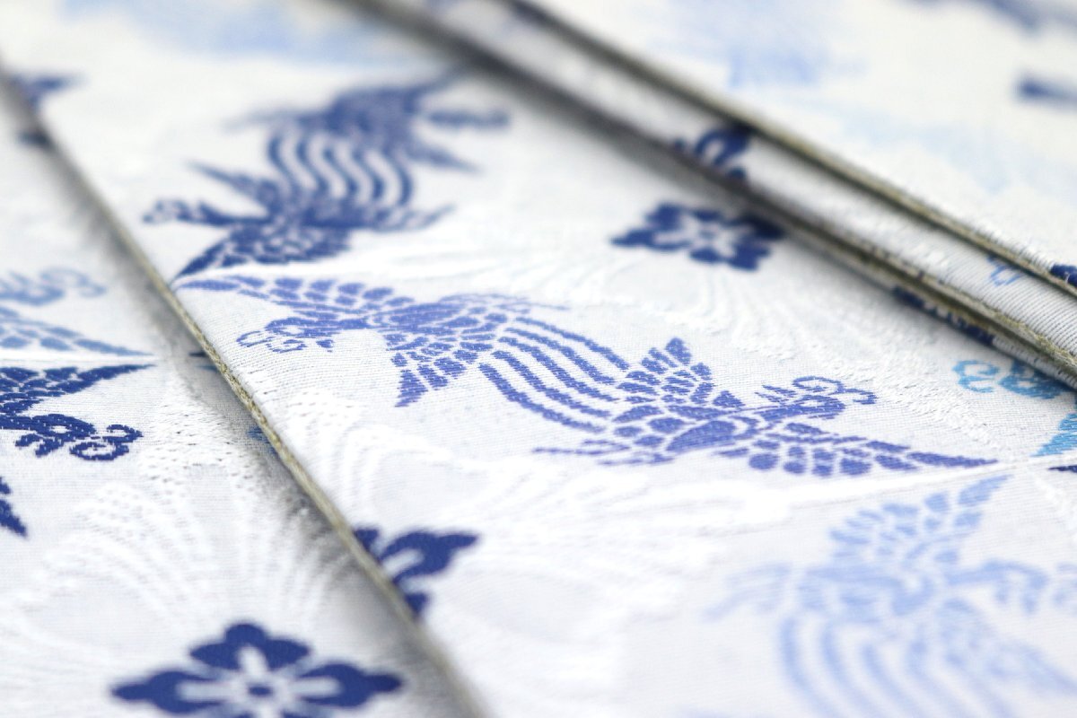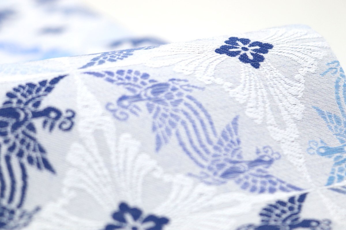全体には、白色、j紺色、ライトブルーなどのお色目で、鳥襷文様が織り上げられております。