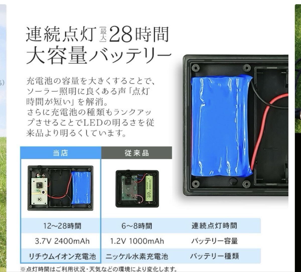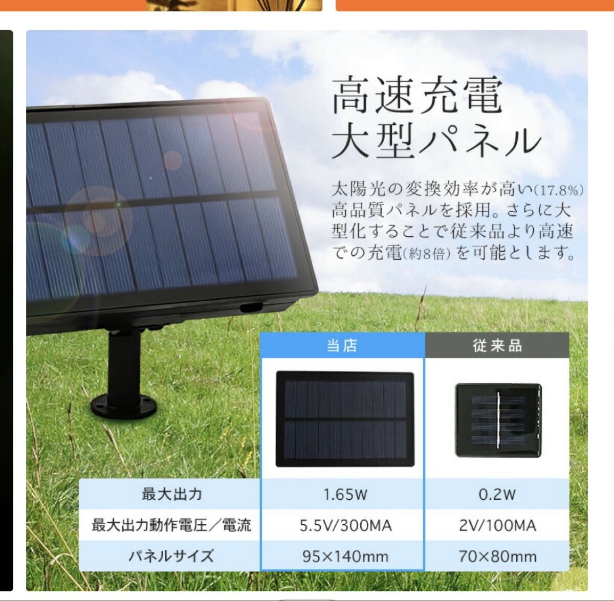 太陽光の変換効率が高い、大型の高品質パネルを採用。さらに大容量(2400mAh)のバッテリーを搭載することで、長時間点灯が可能となりました。