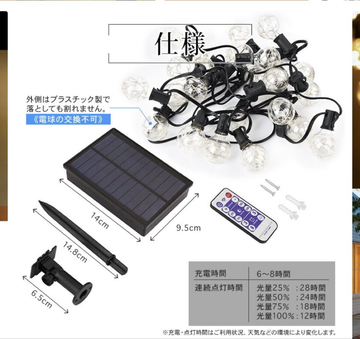 商品内容ソーラーイルミネーション(ソーラーパネル含む)本体×1、支柱(アンカー)×2、リモコン×1、壁面取付用ネジ・壁面アンカー×各2