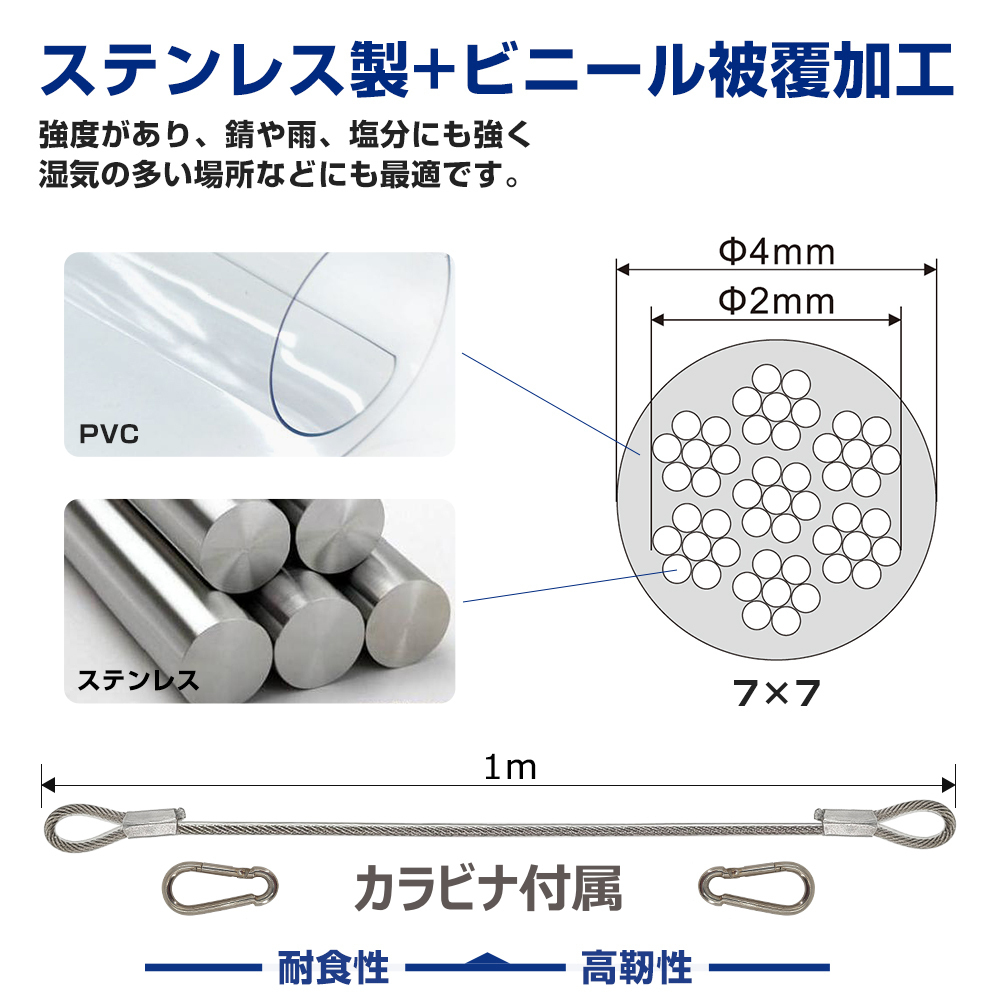 材質 | 芯材:ステンレス ビニール被覆:PVC カラビナ材質:亜鉛めっき鉄 | ||