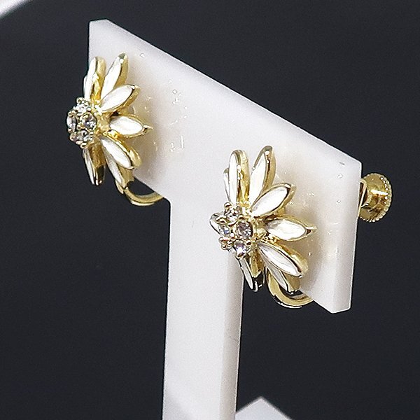 DKG★送料無料 BVA422★ 美品 ラインストーン フラワー イヤリング ネジバネ式 ゴールドカラー ホワイト 白 花 フラワーイヤリング