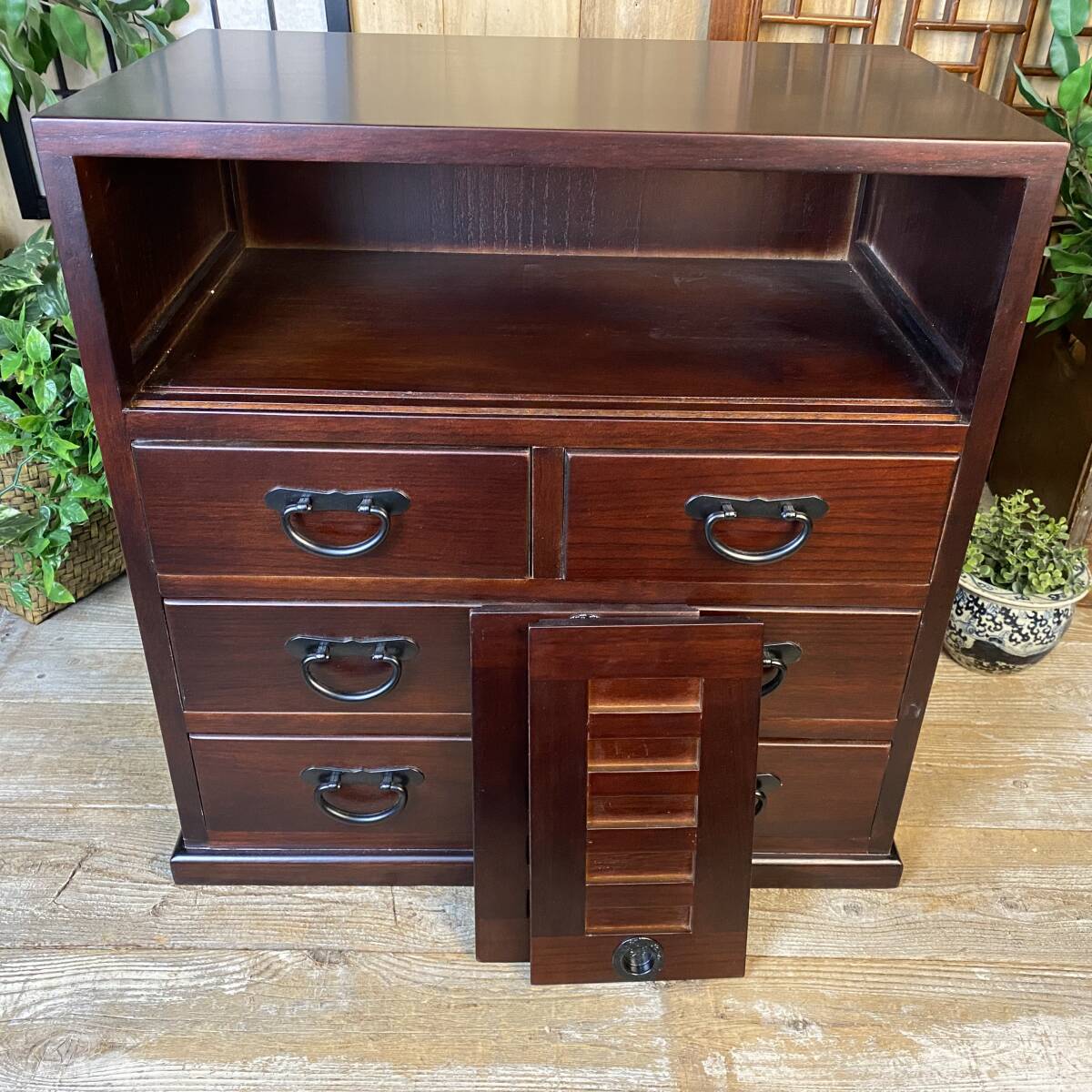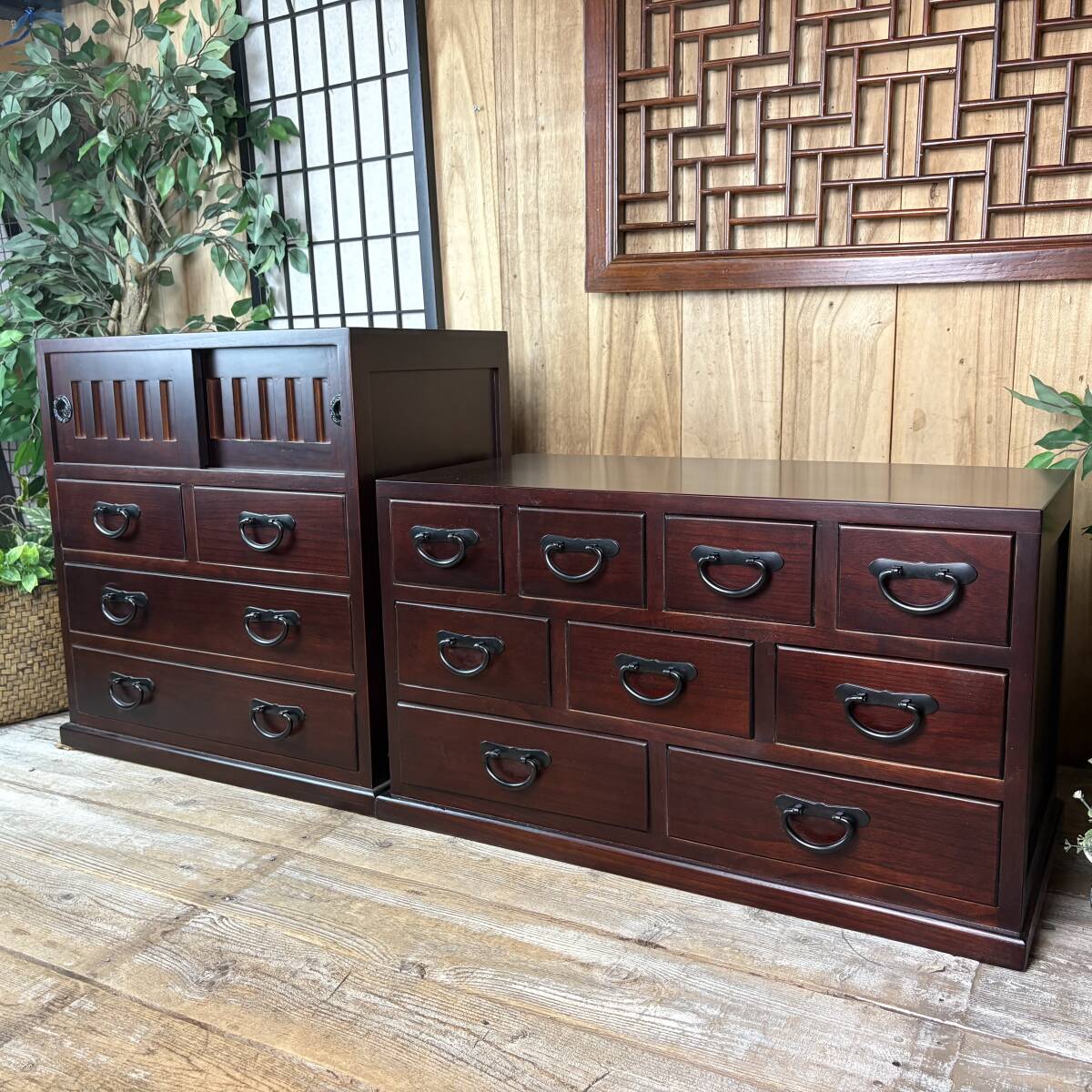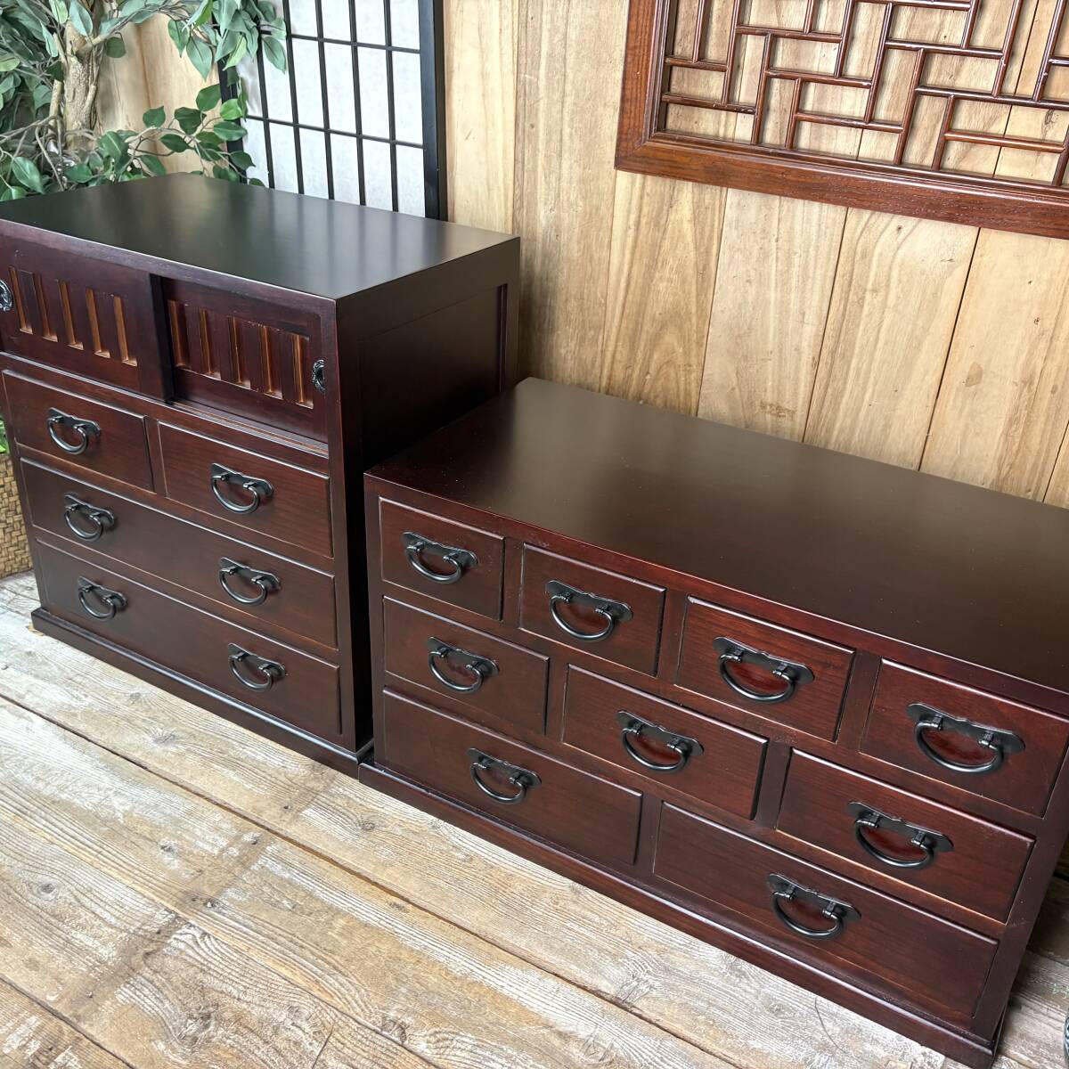 ◆◇商品詳細◇◆ 民芸家具多引き出しタンス 民芸調和多引き出しタンスチェスト二点セットです。古き良き和の心、深みのあるお色が素敵な品です!お部屋のインテリアやショップのディスプレイ、和室にも合わせやすいですよ!小ぶりなタンスですが、引き出しが多く、小物をたくさん収納できます。アパート小部屋、施設ルーム、寮部屋などに最適なサイズ感です。和室や、アジアンテイストインテリアに良く合うお品です。天板が広く、飾り台やテレビ台などにもアレンジできそうですね! 【商品状態説明】 小キズあり、まずまずの美品。 完成品になります。 ※こちらの商品は、新品未使用品ですが、現品画像ではありません。製造段階や輸入段階での小キズ等で検品落ちしたB級アウトレット品の中から順番に発送しております。ほとんど気にならない程度の小キズになり、使用には全く問題はございません。 【サイズ】 引き戸付タイプ 横幅:56cm(下部土台含む横幅:58㎝) 奥行:34cm 高さ:58cm 引出し内寸小22.5㎝×29㎝×8㎝ 引出し内寸大49㎝×29㎝×8㎝ 引き戸内内寸52㎝×29㎝×14㎝ 横長タイプ 横幅:70cm(下部土台含む横幅:72㎝) 奥行:34cm 高さ:41cm 引出し内寸小12.5㎝×29㎝×8㎝ 引出し内寸中18㎝×29㎝×8㎝ 引出し内寸大29㎝×29㎝×8㎝ 木製桐材無垢 【カラー】 ブラウン | ◆◇発送方法◇◆ ●送料は基本無料ですが、沖縄・離島などにお住まいの方はご負担ください。 (沖縄・離島の方はメールにてご連絡いただければ、送料をお知らせいたします。) ●ヤマト運輸・佐川急便・第一貨物のいずれかにて配送いたします。 (運送会社の指定はできません。ご了承ください。) ●日時・時間指定のある方や、お問い合わせ(追跡)番号をご希望の方は取引連絡の際にお知らせください。 | |