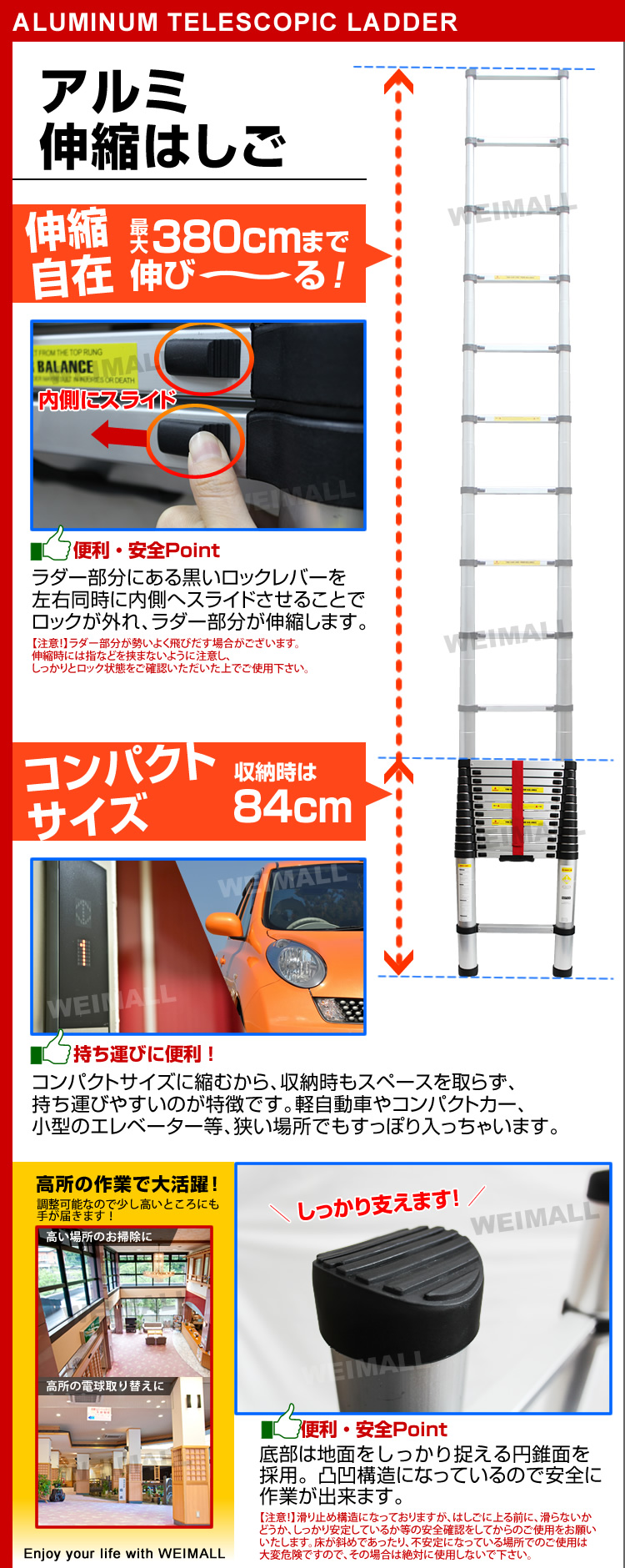 大人気アルミ製スーパーラダー新型ついに新登場! 伸縮自在! 使用時には段階毎に引き伸ばし、必要な高さでロックできます。 コンパクトで持ち運び楽々。乗用車のトランクにもすっぽり入ります。 庭のお手入れ、高所作業に大活躍 底部は地面をしっかり捉える円すい面を採用 段落ちしない安全ロック付。1段ごとに必要な高さに調節可能。 【商品仕様】 全長(約)80cm~373cm 全幅(約)48.5cm 奥行(約)8.5cm 製品質量(約)11kg 階段:13階段 最大積載重さ(約):150kg 素材 : アルミ ※写真と実物は多少異なる場合がございます。あらかじめご了承下さい。 |