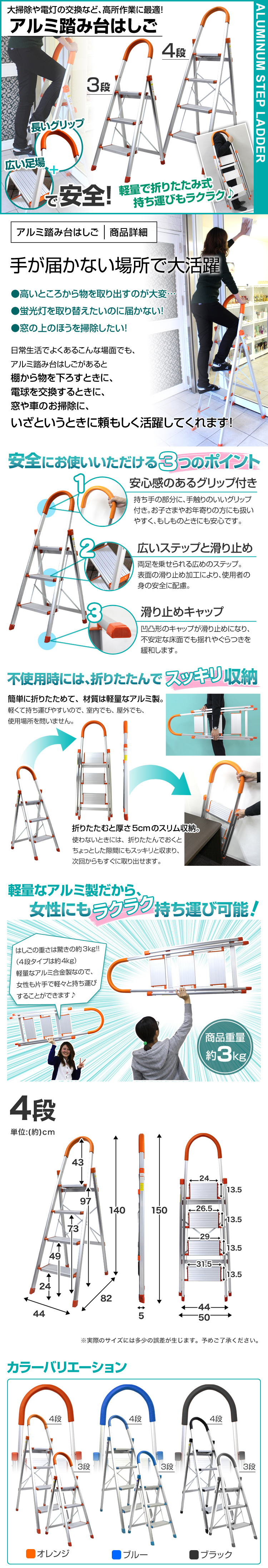 | 折り畳み式 アルミ製脚立 (踏み台 ステップ台 ステップラダー) 耐荷重(約):130kg 段数:4段タイプ カラー:橙/オレンジ 一家に一台あると便利! 照明器具の交換や、高い位置になる棚から物を取り出すときに 便利な折りたたみステップ台です。 持ち手がついて安心!最上段まで上れますよ♪ アルミ製なのでとっても軽い!女性でも余裕で持てる! サッと持ち運べて移動もラクラク! 未使用時はコンパクトに折りたたみ、省スペースに収納できます。 ・高い所の窓拭きに ・食器棚の上棚の収納に ・電球や電灯交換に ・撮影スタンド用に ・エアコン掃除に ・車の洗車に ・壁に時計など飾るときに ・愛の告白に(?) などなど いろんなシーンで大活躍です! ぜひ使ってみてください♪ |