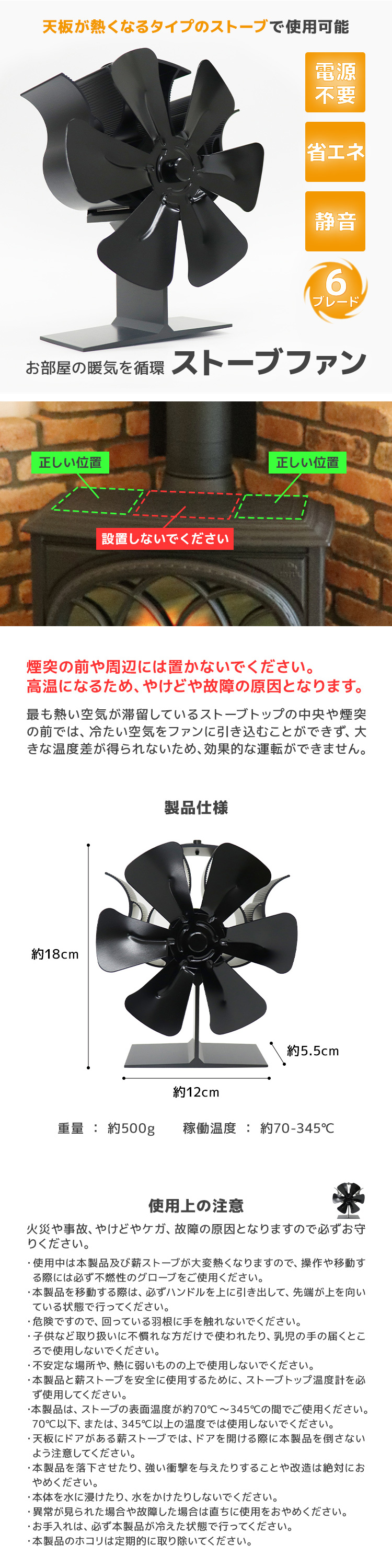 お部屋の暖気を循環!ストーブファンです!! 暖かい空気を部屋全体に届けます。 ストーブの上に置くだけ!熱で回るECOなファン!! 電源不要&電気代0円!省エネです♪ 静音設計でファンの音も気にならず、いつでも安心してご使用いただけます。 温度計機能付き。 ファン上部にモニターがあり、暖炉等の天板が適正温度か簡単に確認できます! 冬キャンプでの防寒対策としても抜群です☆ 【商品仕様】 サイズ:(約)高さ18cm×横幅12cm×奥行5.5cm 重量:(約)500g 稼働温度:(約)70~345℃ 【注意事項】 ・商品は、モニターによって色合いが異なって見える場合があります ・仕様/デザインは改良のため予告なく変更することがあります |