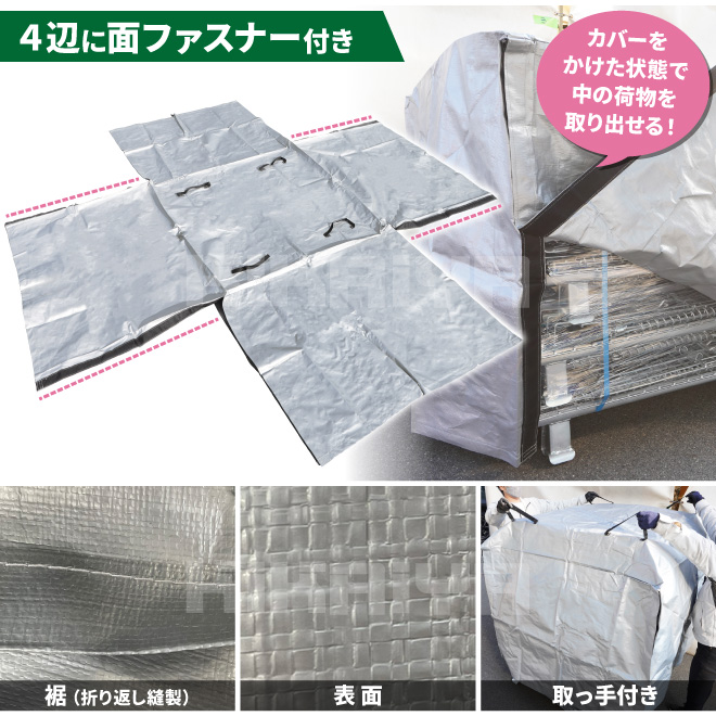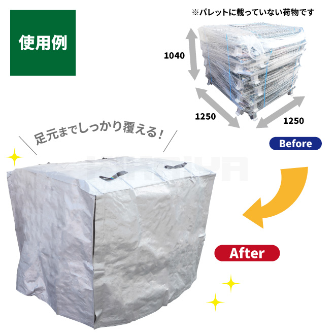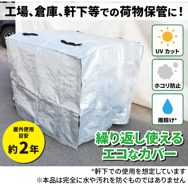 ●工場、倉庫、軒下等での荷物保管に最適なカバーです ●日焼け防止(UVカット)、ホコリ防止、雨除けに ※軒下での使用を想定しています ※本品は完全に水や汚れを防ぐものではありません ●環境にやさしい繰り返し使える資材です ●4辺に面ファスナーがついており、カバーを展開することも可能です カバーをかけた状態で中の荷物を取り出すことも可能、一人でのカバー脱着も簡単です ●11型(1100×1100mm)のパレットより幅が広く、オーバーハングしている荷物にも対応可能です ●屋外使用目安 約2年 ※屋外でご使用の場合、台風などの強風時にカバーが飛ばされないようご注意ください |