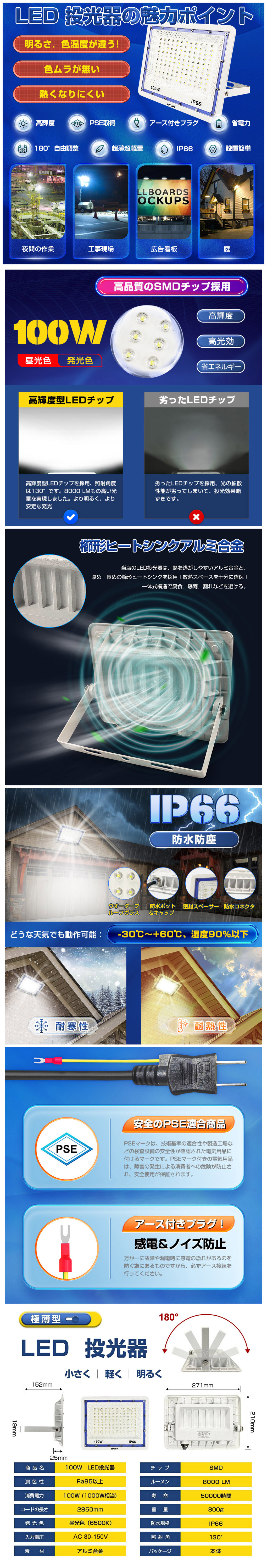 ◆軽薄化LED投光器: 1KG未満の軽量だから壁への負担を掛けずに壁掛けが可能、駆動内蔵設計で投光器の厚さはわずか2.5CMでよりスッキリと設置できます。 ◆高品質&長寿命: 動作環境-30℃~+60℃、湿度90%以下、どんな天気でも動作可能。耐寒性耐熱性に優れているの上、50000時間の長寿命を持つ ◆超高輝度投光器: 優高輝度LEDチップを搭載で明るさは抜群、ハロゲン、水銀灯より80%消費電力を節約できます。 ◆IP66ラベルの防水性能: 密封性に優れ、IP66相当の防塵防水性能を実現!場所を選ばず様々な用途の照明に使えます。 ◆驚きの長寿命: 本製品は50000時間以上の長寿命で、他の商品の2000時間を遥かに凌駕します。 ◆照射角度調整可能: 回転支えを使えて、お好みに照射角度を調整できます。 ◆広い使用範囲: トンネル、掲示板、ガソリンスタンド、夜間作業、現場工事、駐車場、公園、運動場にも様々な場所で活躍します!公園、運動、屋外や現場作業にも便利です!特に、夕暮れ時夜間作業にとても役立ちます! 虫が集まりにくいの も魅力です。 【保証】 ◆当商品は12っヶ月保証となります。 ◆お届けから1週間以内にご連絡のあった不良品の保証対応の送料は当方が負担いたします。 ◆保証期間内の不良品ですが、交換のみ対応しております。往復送料はお客様負担となります。在庫がない時だけ返金しますので、ご了承ください。 |