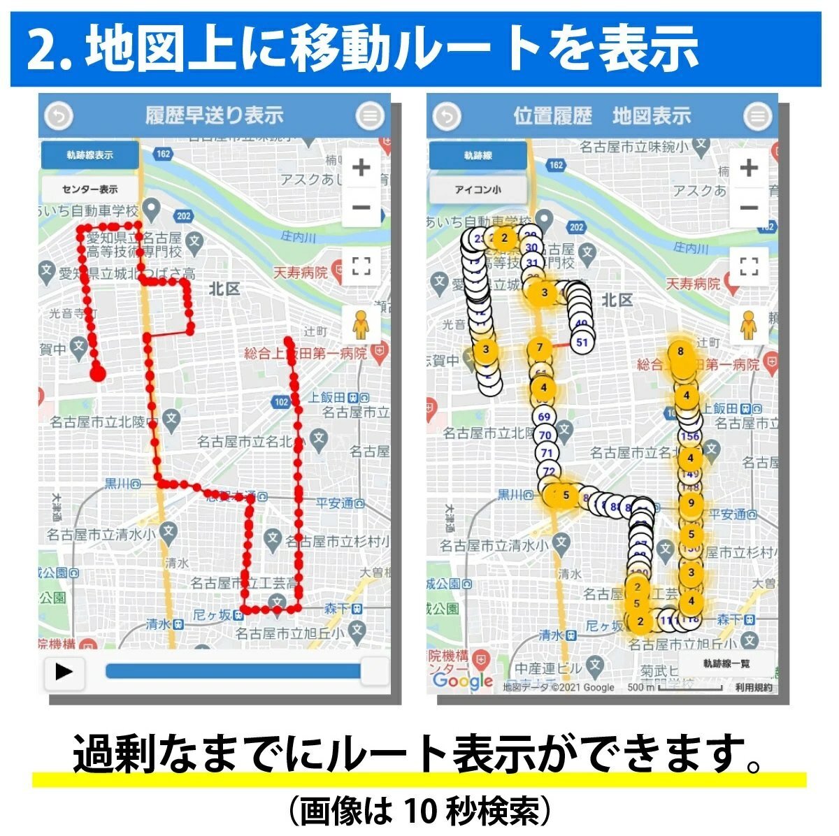 地図上でどのように移動したかを視覚で確認出来る、出来ないでは行動把握に大きな違いがあります。