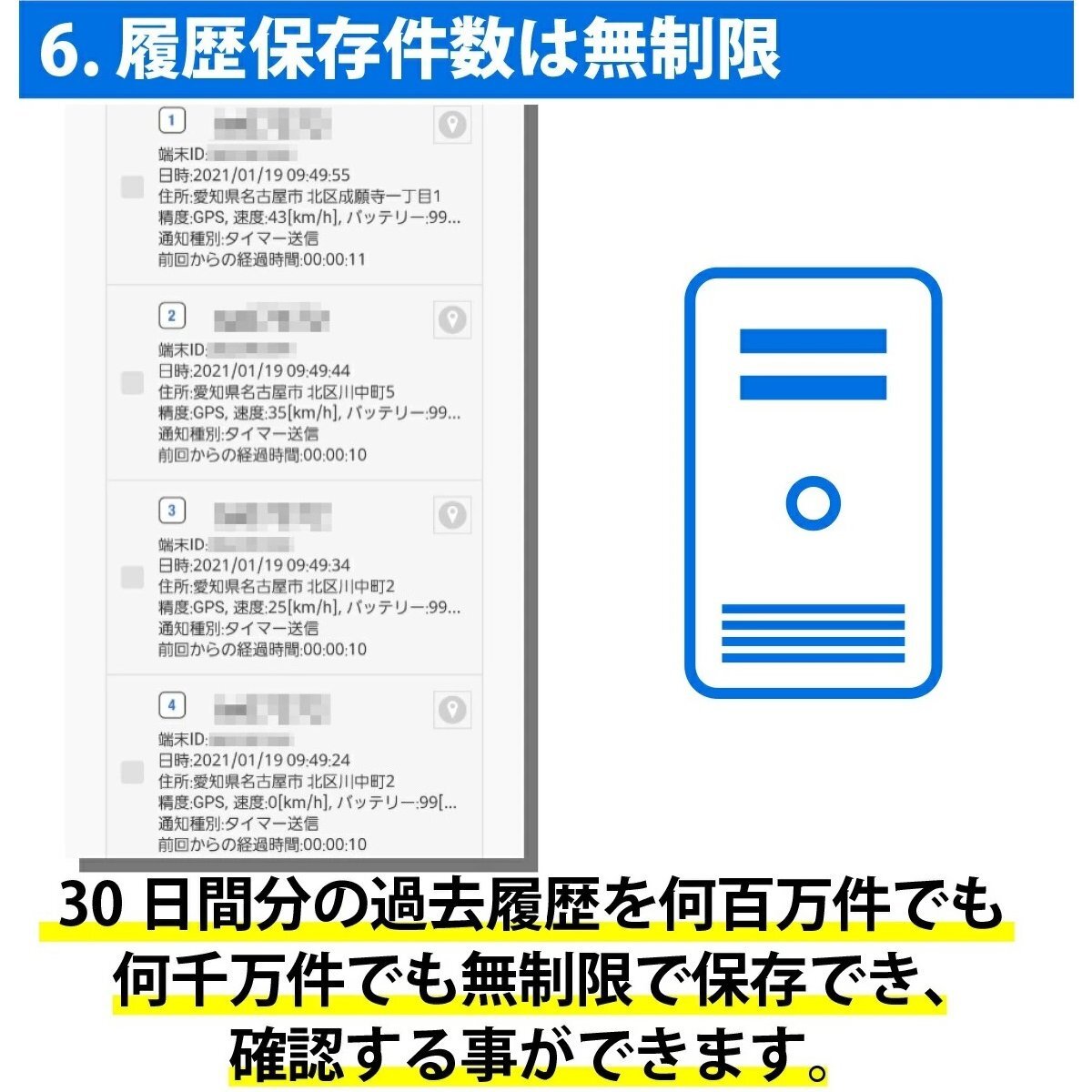トラッキモeは何百万件でも30日間の履歴を全て自動で記録します。