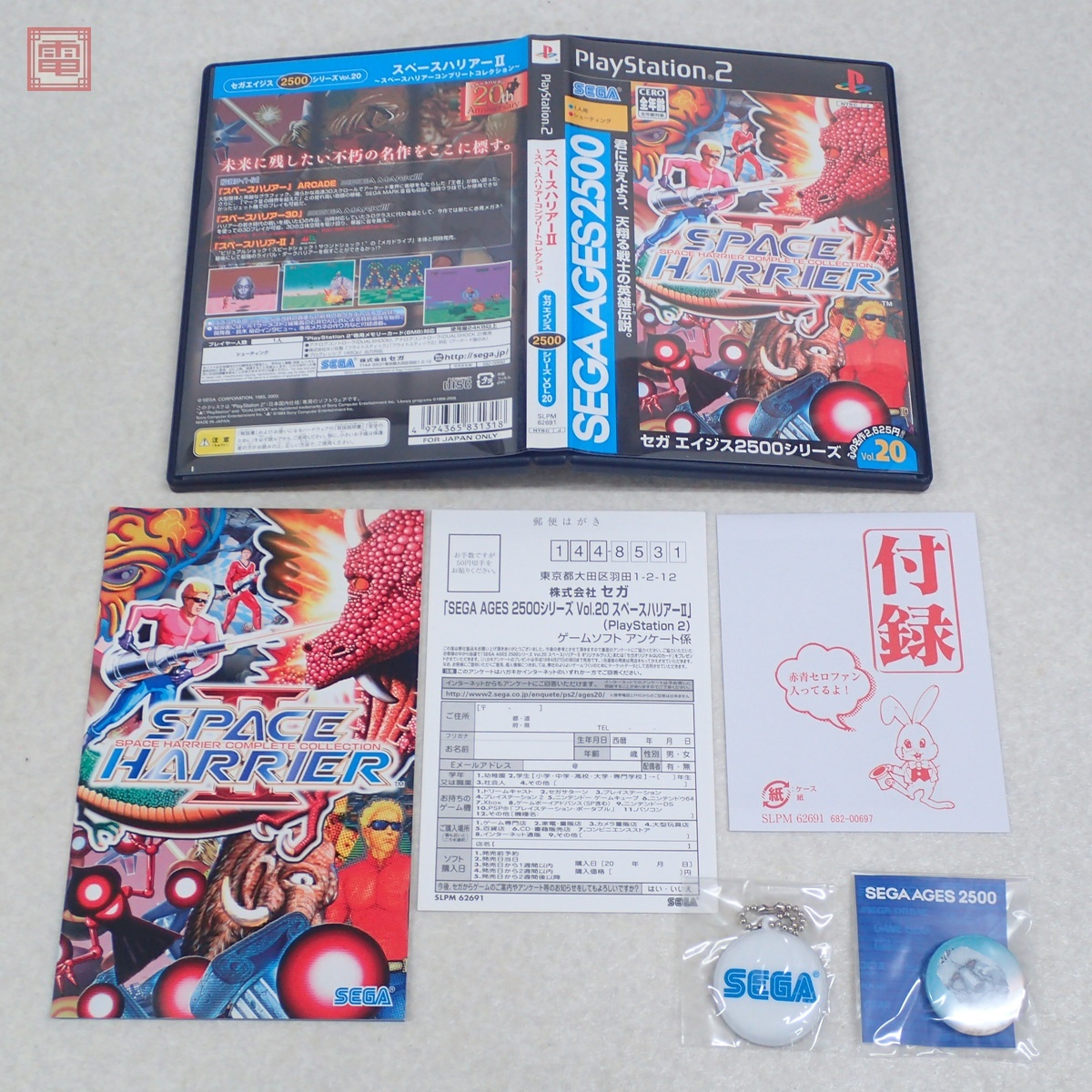 動作保証品 PS2 プレステ2 スペースハリアーII コンプリートコレクション セガエイジス2500シリーズ Vol.20 セガ SEGA 箱説/特典付 こちらの商品は動作保証品となりますので、一週間の動作保証をお付けします。 ■ケースにスレ、角スレ、汚れ、ヤケ、キズがあります。 ■取扱説明書にスレ、角スレ、汚れ、ヤケ、キズ、ホチキス部のサビがあります。 ■盤面に目立ったキズはありません。 ■上記以外は未チェックです。 ■写真のものが全てです。付属物の有無や状態については写真からご判断ください。 ■付属物については細かいチェックはしておりませんので、万が一、欠品があったり余計な物が入っていたとしてもご了承ください。 ■商品到着後、当店の保証期間中は、商品及び箱や取説、付属品などを1つでも廃棄や破損をしないようにお願い致します。廃棄や破損をした場合、商品に問題があった場合でも対応や返金などの対処ができなくなります。 ■商品によりますが、発売されてから10年以上経過している中古品である事をご理解頂いた上でご入札をお願い致します。なお、新品や美品、また特記事項がある場合は別途明記します。 | |||