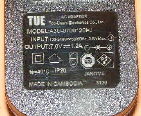 【純正・状態良し/家庭用ミシン ハローキティ(MODEL525)等用電源】☆ジャノメ MODEL A3U-0700120HJ (for JA525・KT-35/送料:390円~)