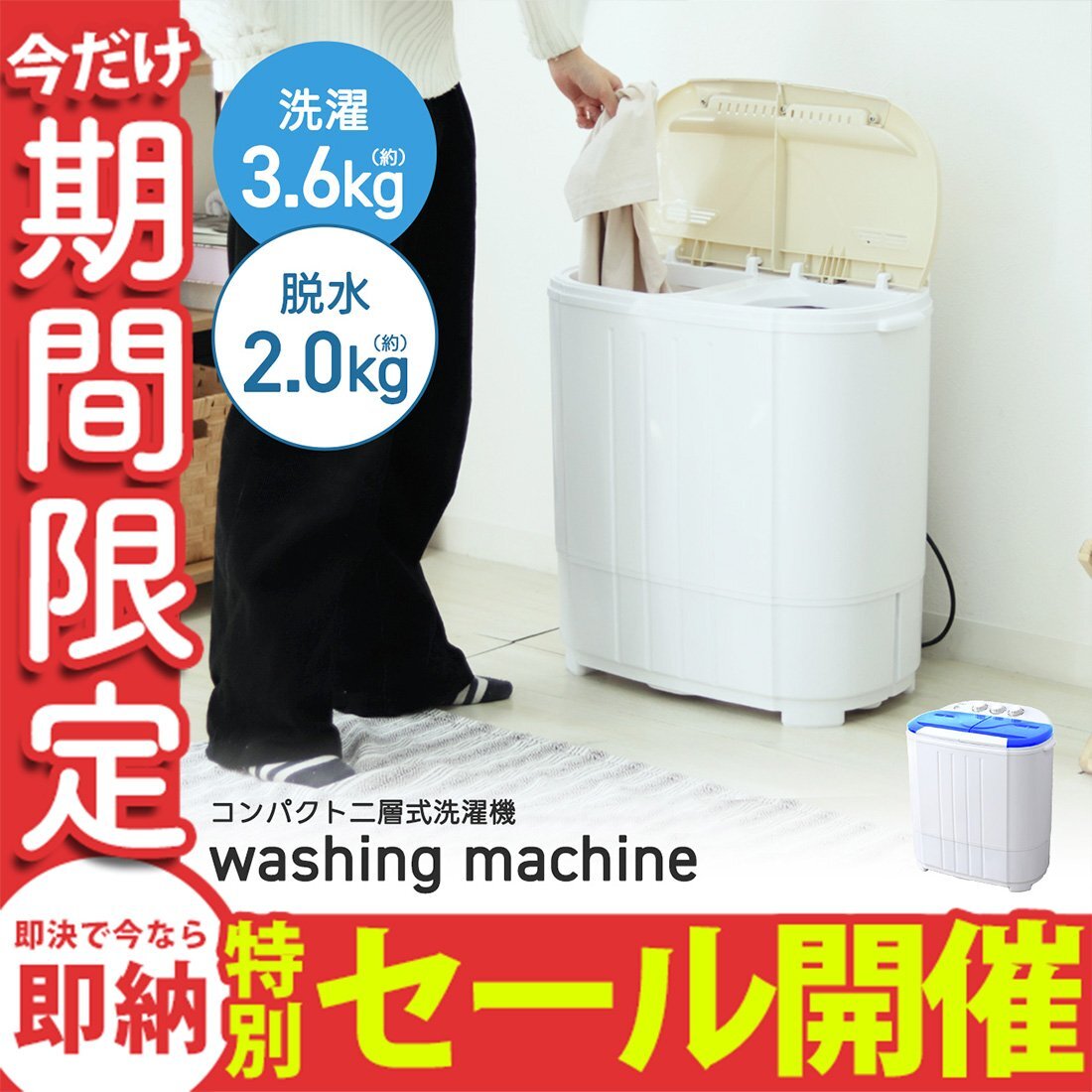 | 【安心の1年保証付き】 コンパクトだから場所も取らずにちょこっと洗いで節水もできます。 少量の洗濯物や洗い分けに最適! 二槽式だからしっかり洗える! ★こんな場合にオススメ!★ ・ガーデニングや作業で汚れた軍手やエプロンの洗濯 ・学校や部活動で汚れたシューズや服の下洗い ・ベビー用衣類の洗濯 ・海水浴後の水着の洗濯 ・別洗い用のサブ機として 【商品内容】 本体 脱水用おさえさえフタ 吸水ホース 【商品詳細】 カラー:ブルー サイズ:(約)幅550×奥行360×高さ590mm 重量:(約)9㎏ 洗濯容量:3.6kg 電源:AC100V 50/60Hz 定格電力:洗濯:240W 脱水:120W 防水性能:IPX4 ・本製品の脱水は、簡易脱水となっております。あらかじめご了承ください。 ・水がこぼれても大丈夫な風呂場やベランダなどでのご使用をオススメします。 ・分解や修理・改造をしないでください。 ・保管する時は、風雨にさらされる場所や湿気の多い場所に置かないでください。 |