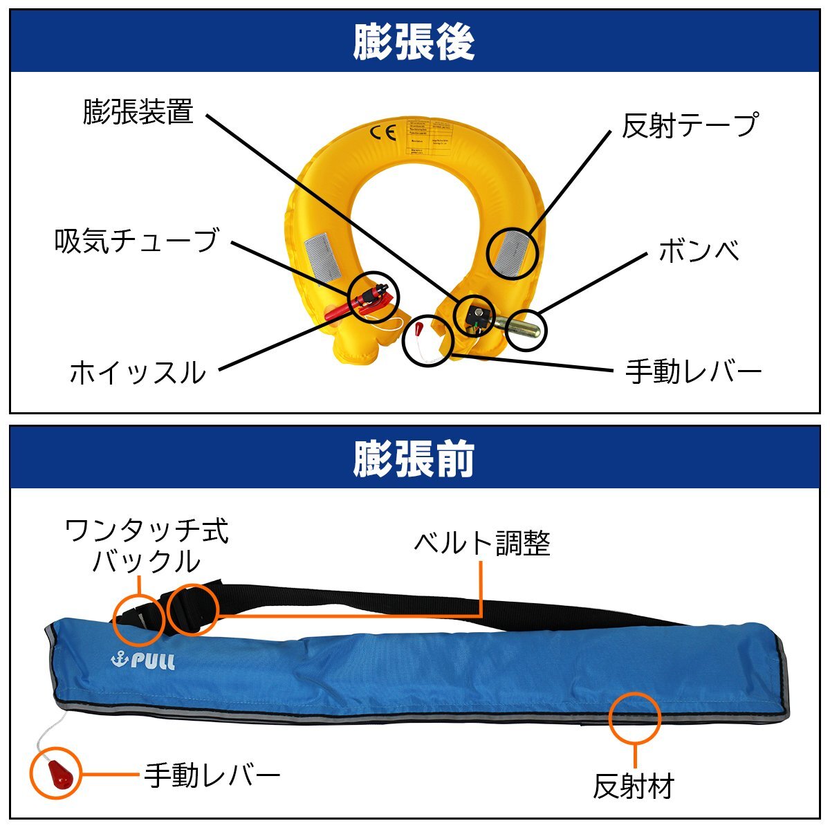 商 品 説 明■動きを妨げないウエストベルト腰巻きタイプのライフジャケット、手動膨張タイプです。