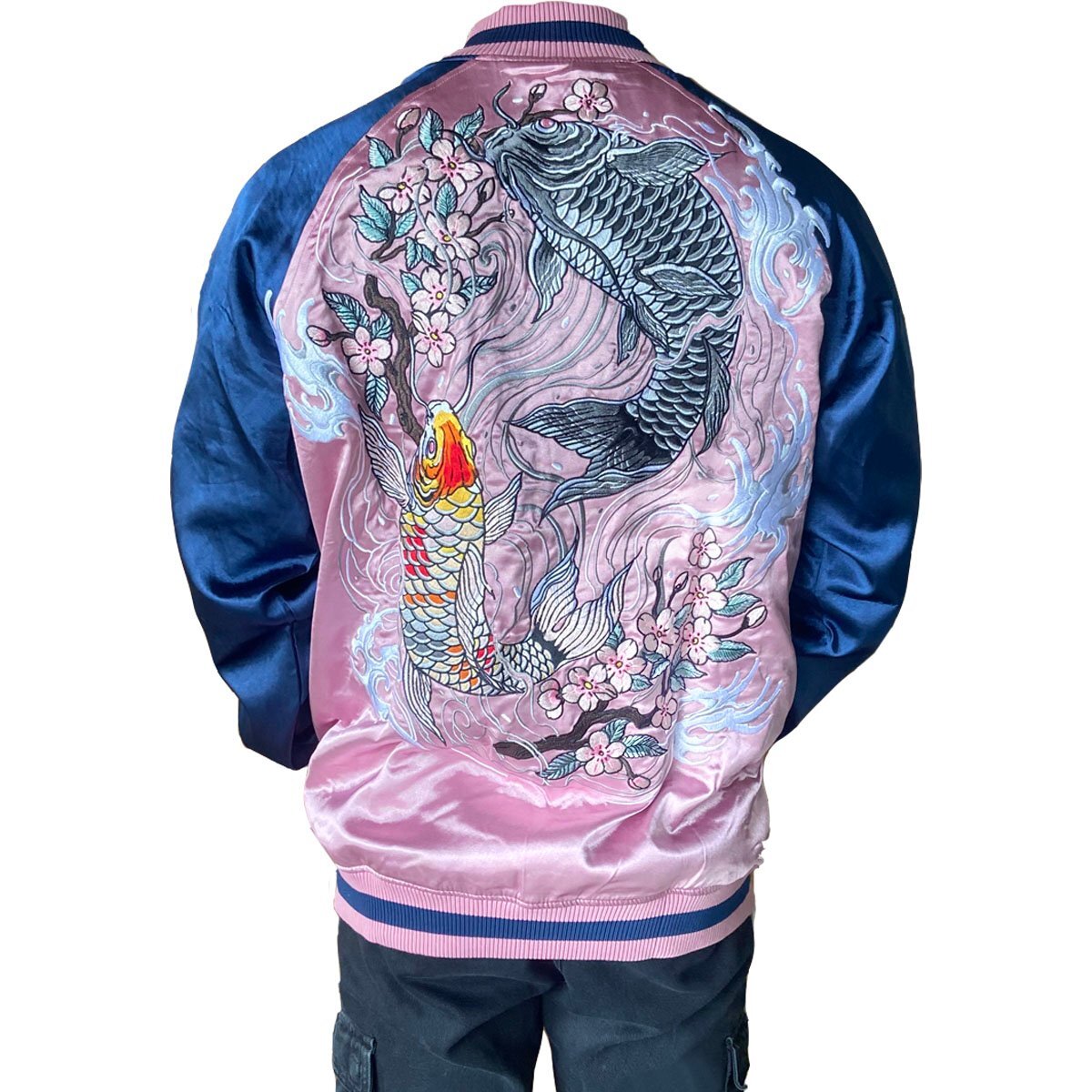 【C00251-3】未使用 L 刺繍 スカジャン ピンク 桃色 鯉 錦鯉 コイ 和柄 スーベニアジャケット サテン