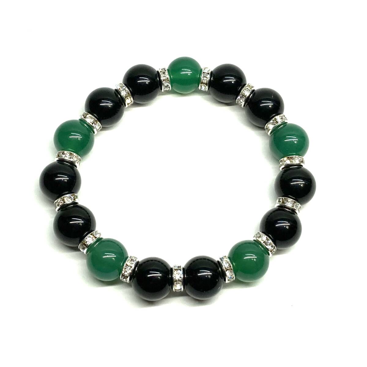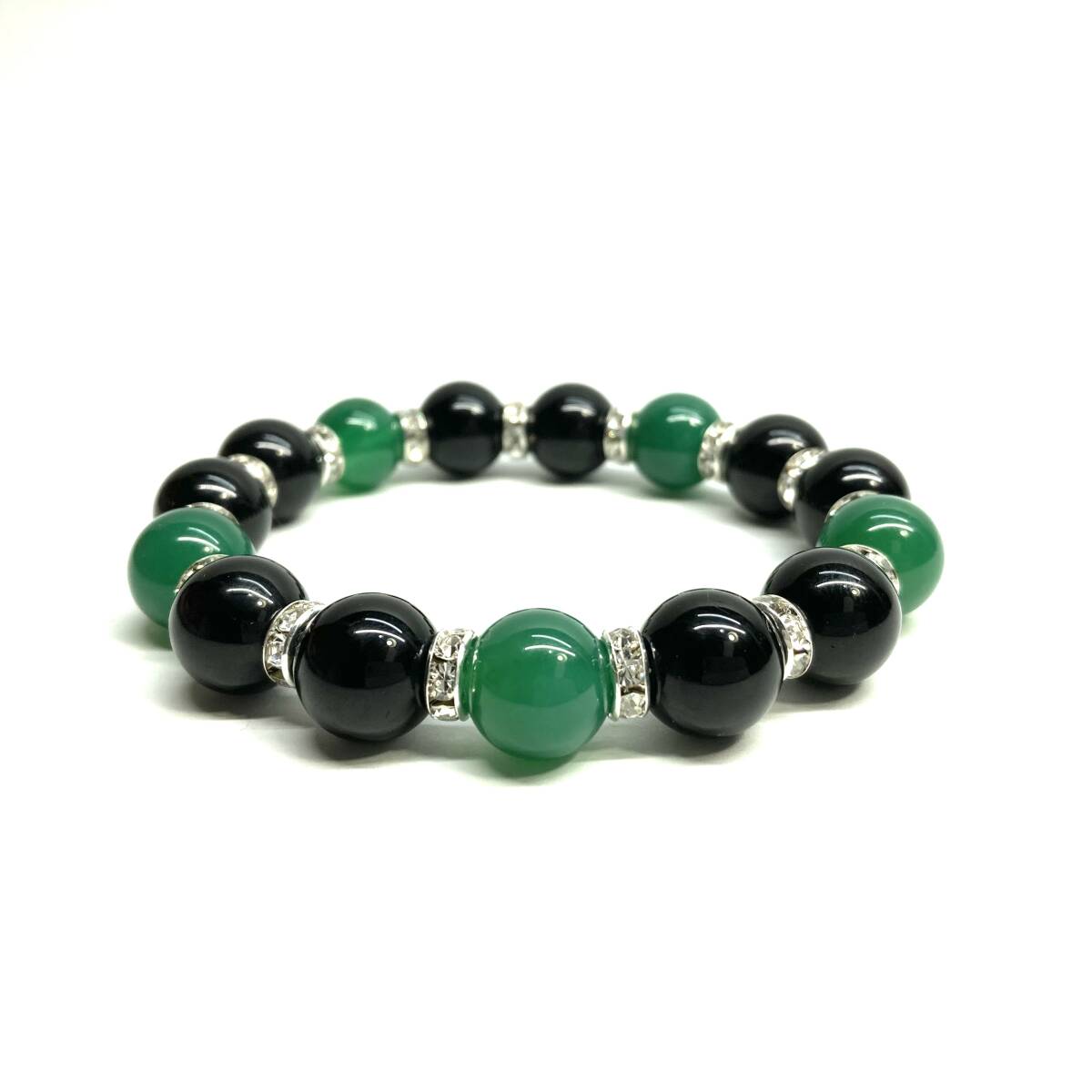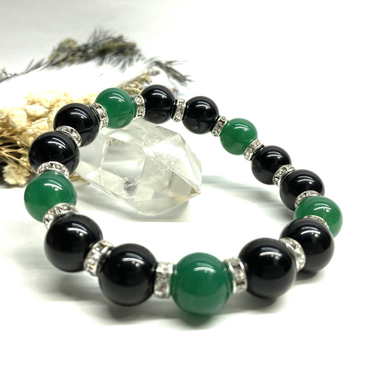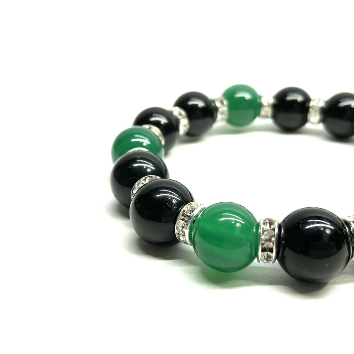 こちらは、モリオンと緑瑪瑙を組み合わせたパワーストーンブレスレットです。間にはロンデルを挟み高級感あるデザインに仕上げております。程よくインパクトがある12mm玉を使用して内周約18cmです。(サイズ変更の場合は取引ナビにてご連絡をお願いします。) 数に限りがございますので気になる方はお早めにどうぞ。