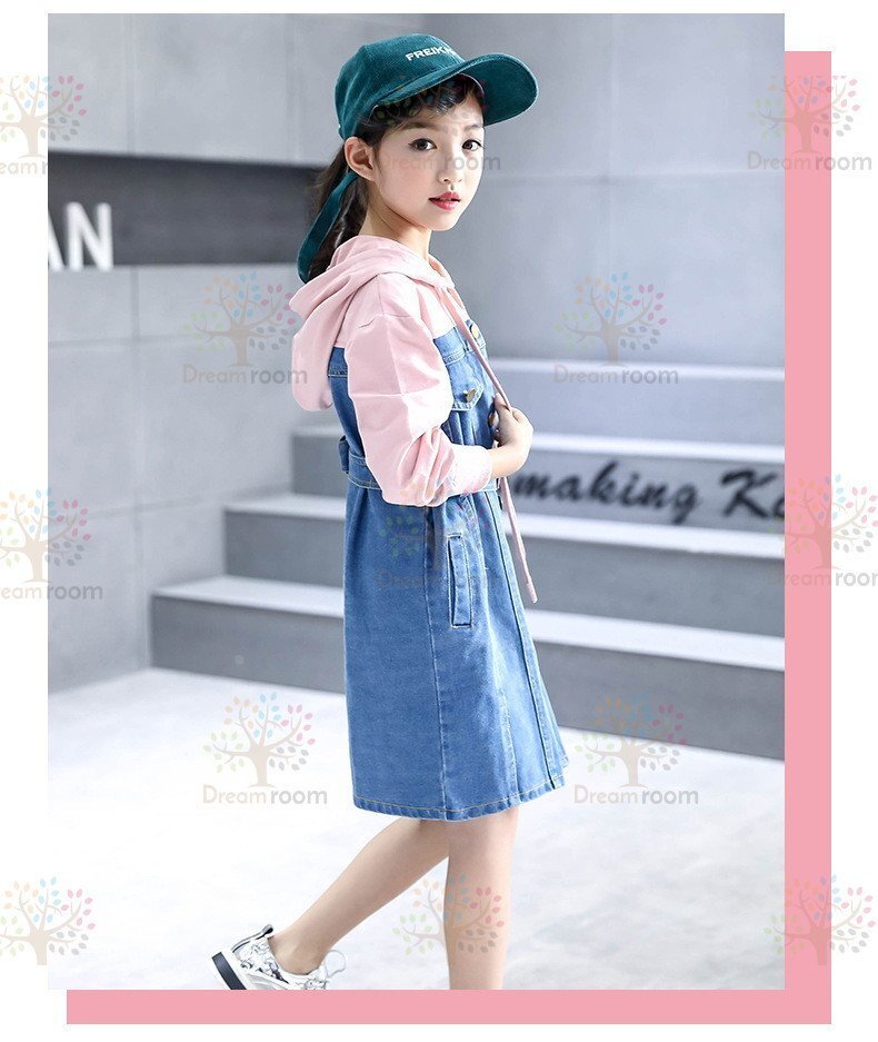 kids デニム切り替え ハイウエスト ワンピース 【130cm】ピンク 女の子 パーカー 学生 秋服 長袖 K-419pk