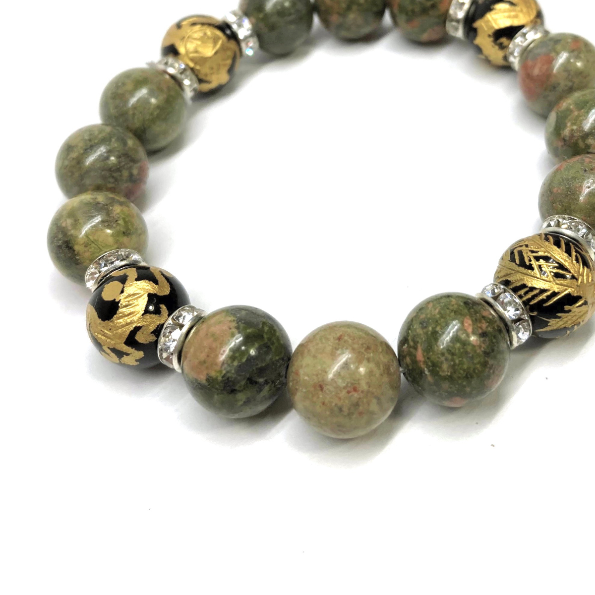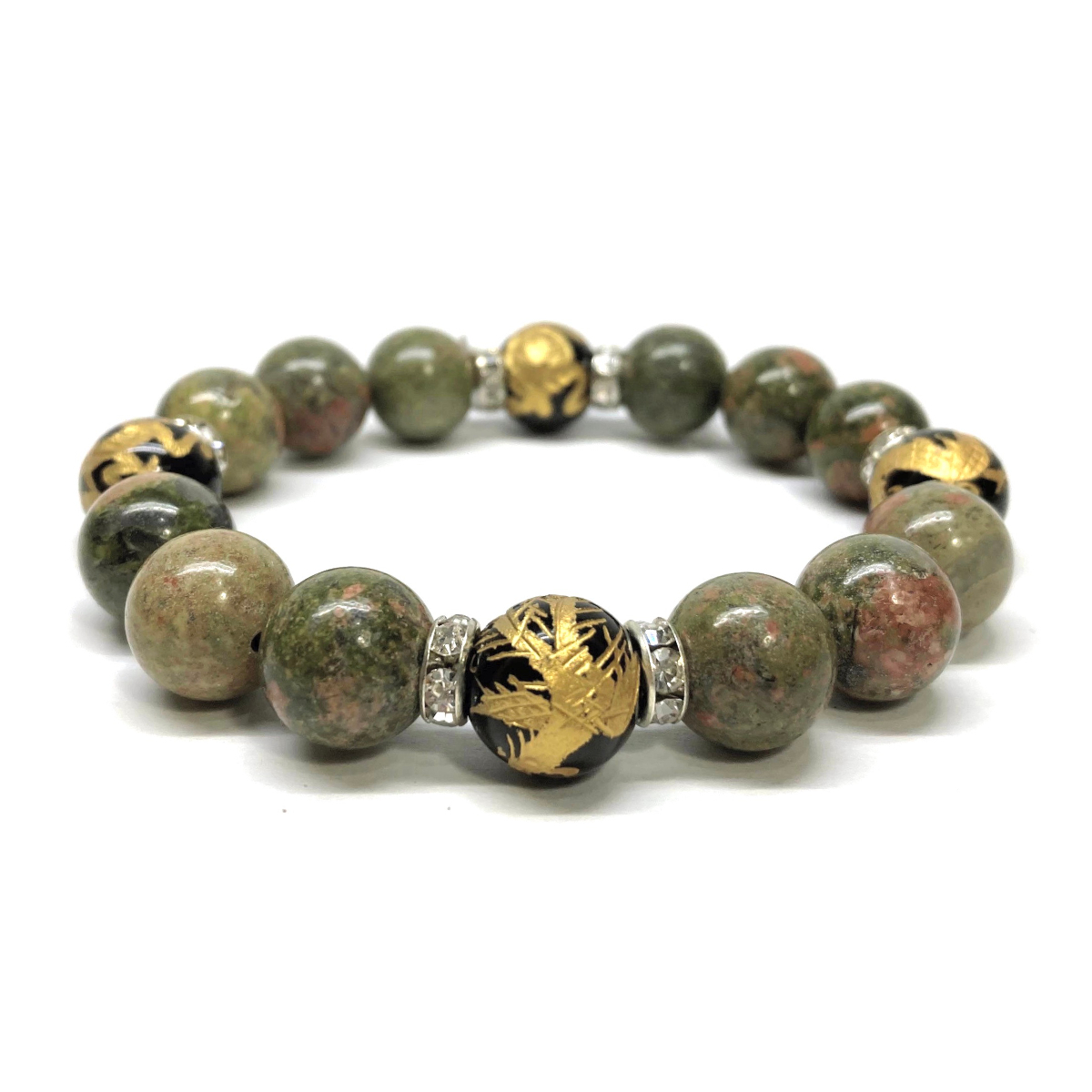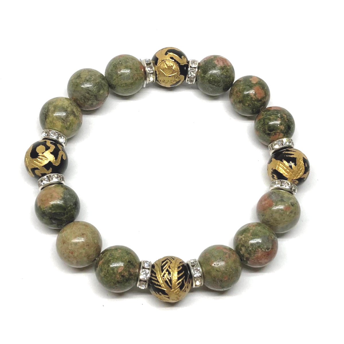 こちらは、四神獣金彫オニキとユナカイトを組み合わせたパワーストーンブレスレットです。四神獣は、中国の伝説で4つの方向(東西南北)を守護する神聖な神。四神獣、厄災から身を守り、多くの運気を呼び込むと言われております。石大きさは程よくインパクトのある12mm玉で内周 約17cmです。 数に限りがございますので気になる方はお早めにどうぞ。