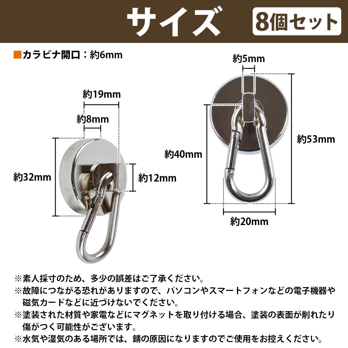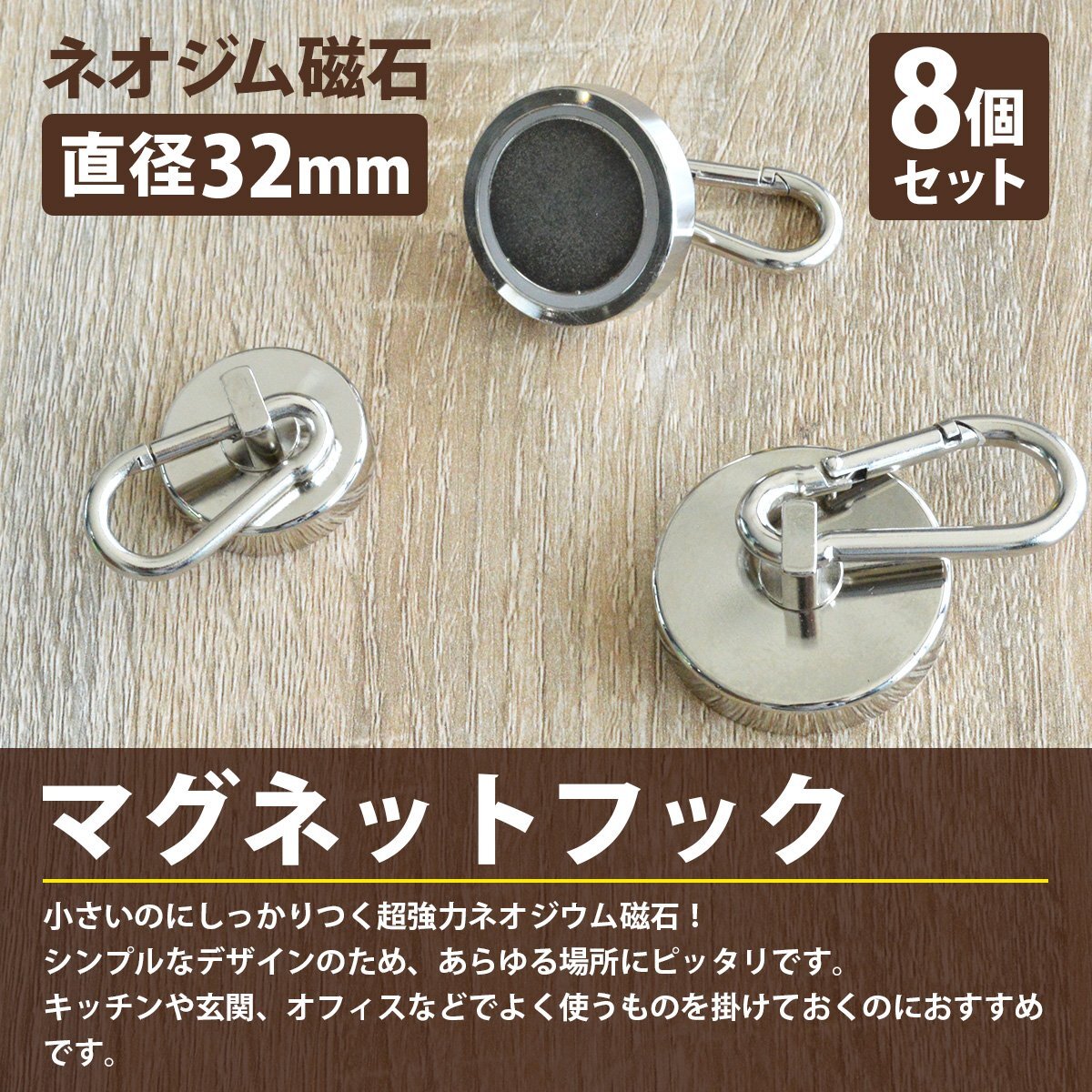 『8個set 直径32mm』カラビナ マグネットフック 超強力 マグネット ネオジム 磁石 フック 防錆 ステンレス製 耐荷重42KG