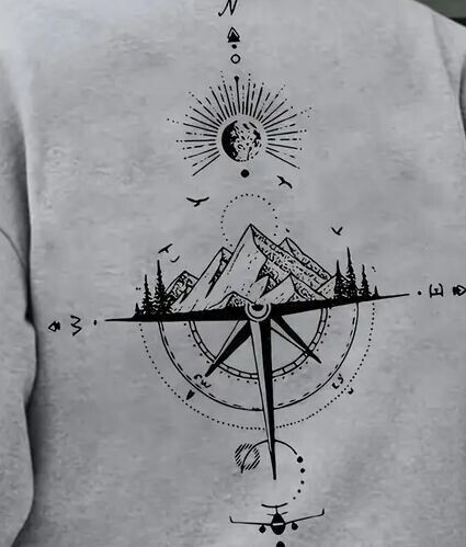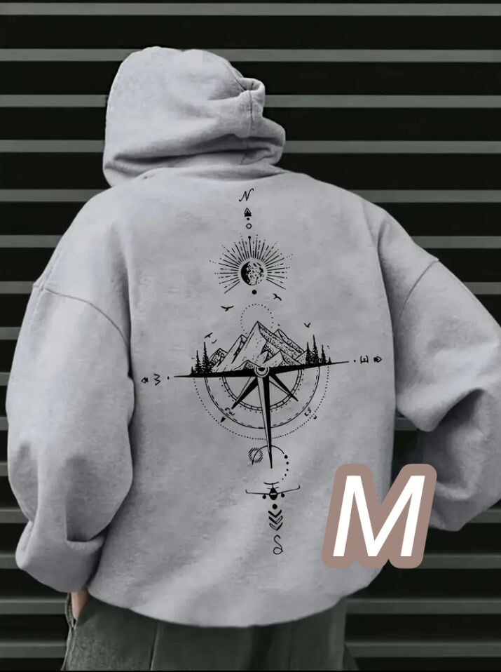 背面に大胆に描かれた「山とコンパス」デザインが印象的なメンズパーカー。