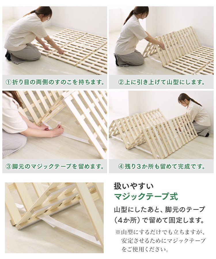 すのこマットで湿気対策! 通気性抜群で湿気を抑制します。 風を通しやすい極厚2.7cm。 床からの高さを設けることで通気性を高めています。 4つ折りなのでそのまま布団を簡単に室内干しができ、使わない時はコンパクトに収納可能。 軽量設計で持ち運びも楽々。 天然の桐材を使用。抗菌・防虫・防腐効果があります。 桐は、断熱性と保温性に優れ、寝具を床の冷たさから守ります。 安全性を考慮してマットの角には面取り加工が施されています。 さらに床の傷つきを防ぐためのクッション材付き!。 家族みんなで安心して使えます。 【商品仕様】 タイプ:セミダブル カラー:ナチュラル サイズ:(約)幅120×奥行き196×高さ2.7cm 重量:(約)5.5kg 素材:天然木(桐材)、EVA 他 【注意事項】 ・すのこの上に立つ場合はさん木の上に足をかけるなど強度の弱い部分に体重がかからないようにご注意ください。 ・飛び跳ねたり、一点に荷重をかけたりすると割れる恐れがあります。 ・製造時期によっては若干色味が異なる場合があります。 ・商品は、モニターによって色合いが異なって見える場合があります。 ・仕様・デザインは改良のため予告なく変更することがあります。 |