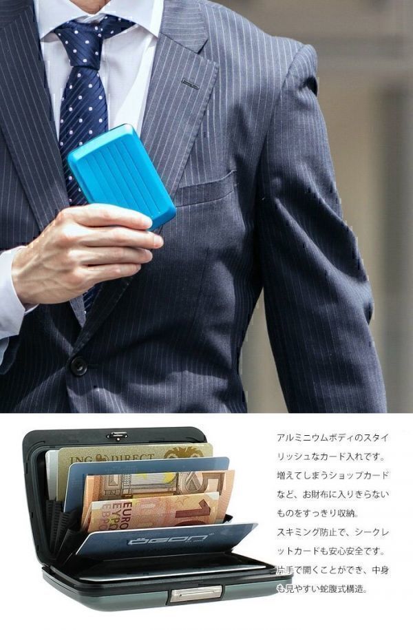 アルミ素材のため軽くて丈夫、スキミング防止機能も備えています。