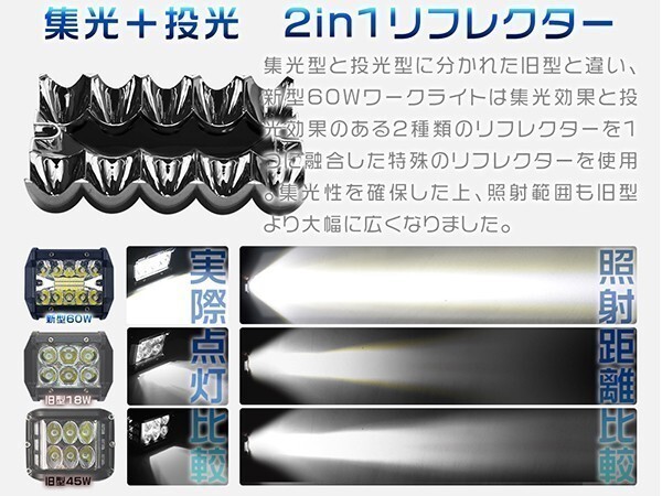 集光型と投光型に分かれた旧型と違い、新型60wワークライトは集光効果と投光効果のある2種類のリフレクターを一つに融合した特殊のリフレクターを使用します。集光性を確保した上、照射範囲も旧型より大幅に広くなりました。