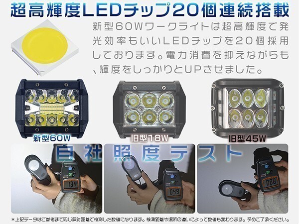 新型60wワークライトは超光輝度で発光効率もいいLEDチップを20個採用しております。