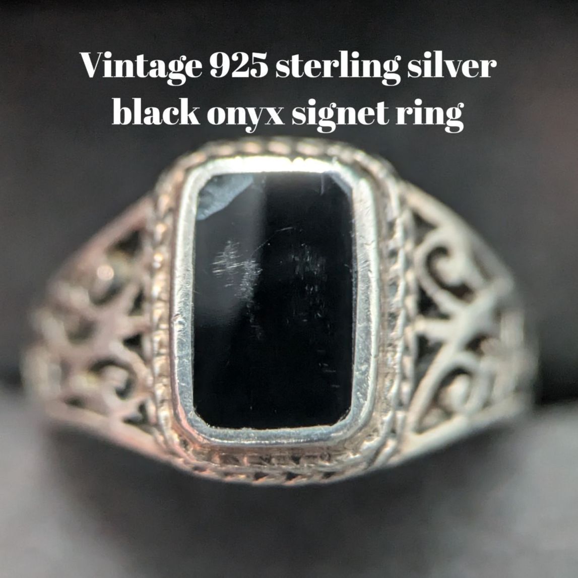 ブラックオニキスを思わせるスクエアストーンをセットした、925スターリングシルバー製のヴィンテージシグネットリングです。