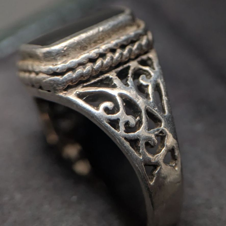 トップは角に丸みのある長方形のブラックストーンをベゼル留めし、その周囲をロープ風の装飾で囲んだクラシックなデザイン。アームは唐草モチーフの透かし彫り(フィリグリー)になっていて、横から見てもレースのように繊細な表情が楽しめます。