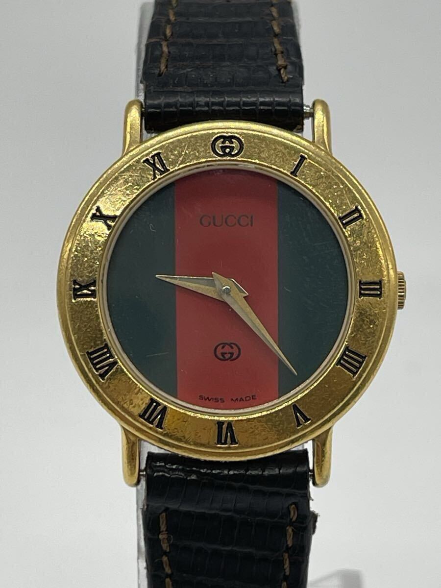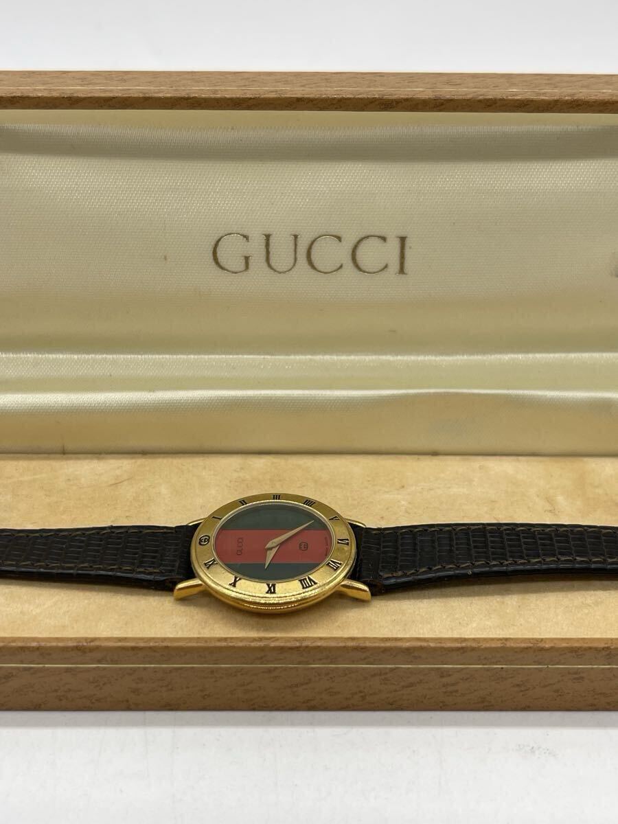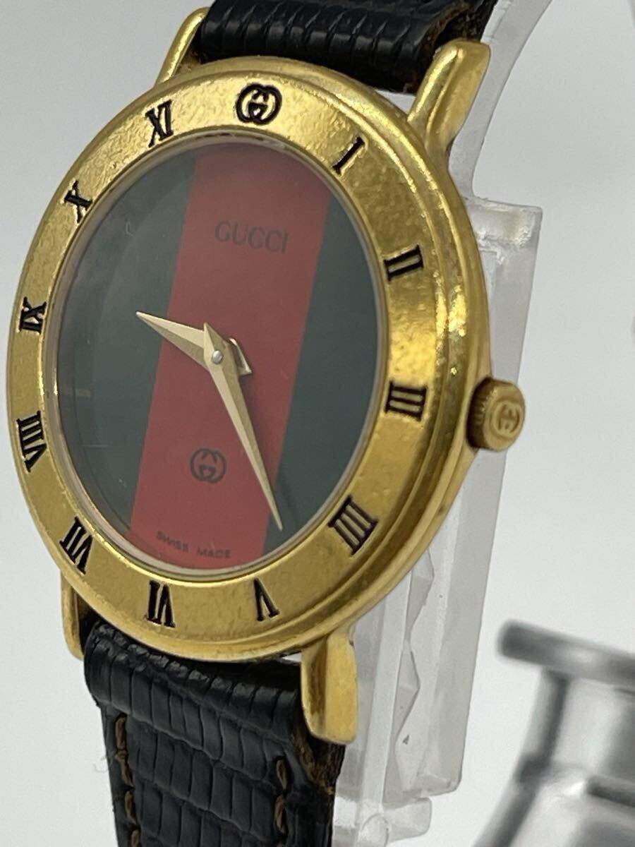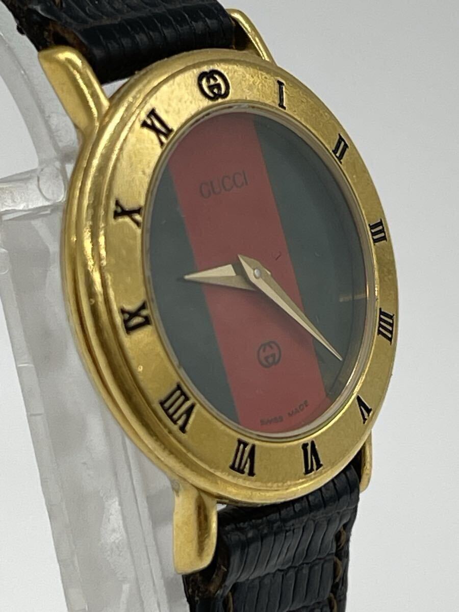 This is a GUCCI 3000L quartz ladies’ watch featuring the iconic red and green dial.