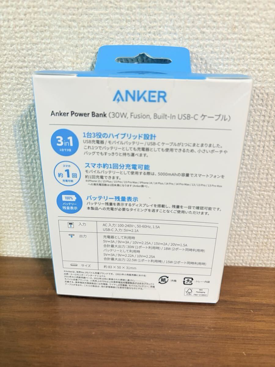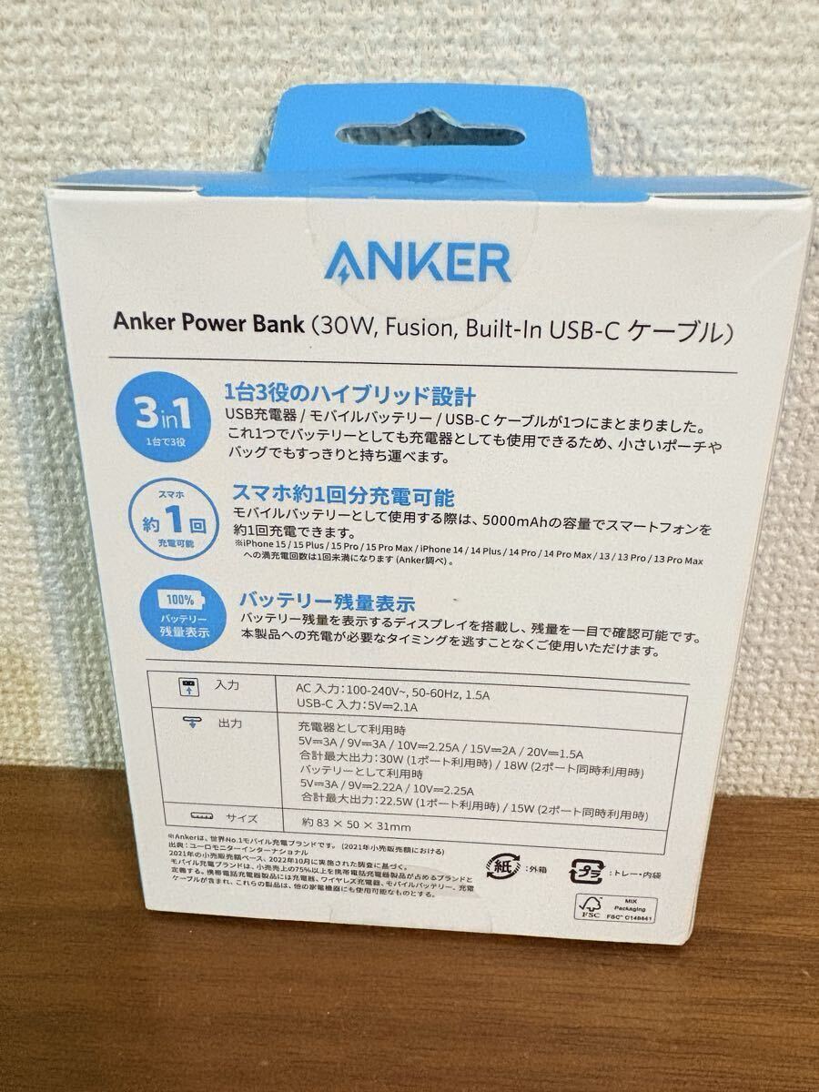 パッケージ内容:Anker Power Bank (30W, Fusion, Built-In USB-C ケーブル) 、取扱説明書、カスタマーサポート