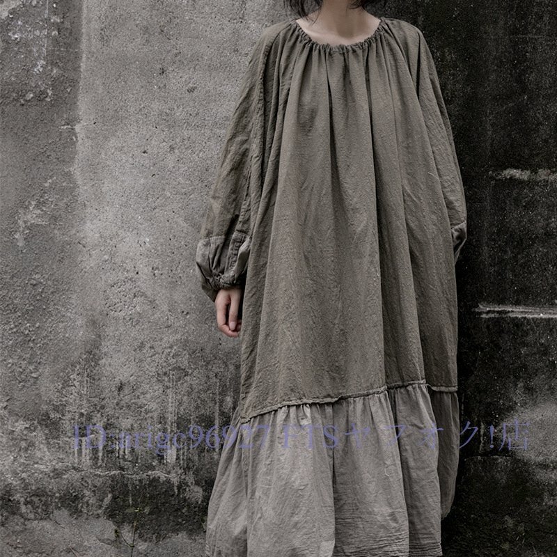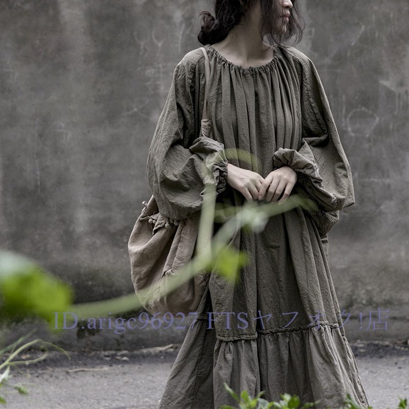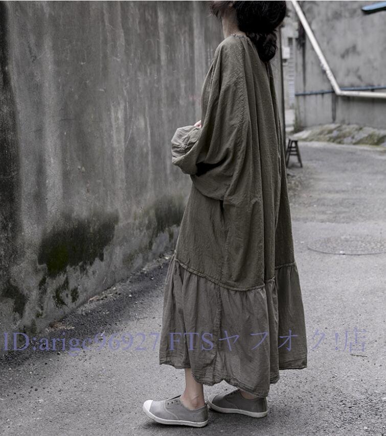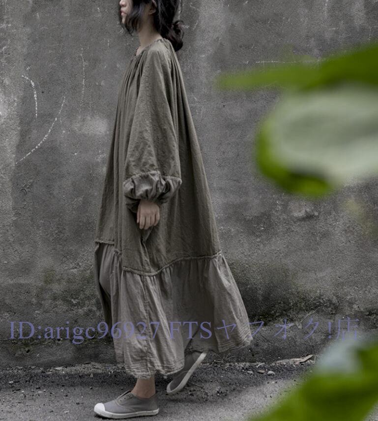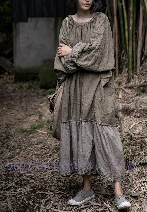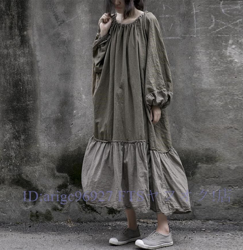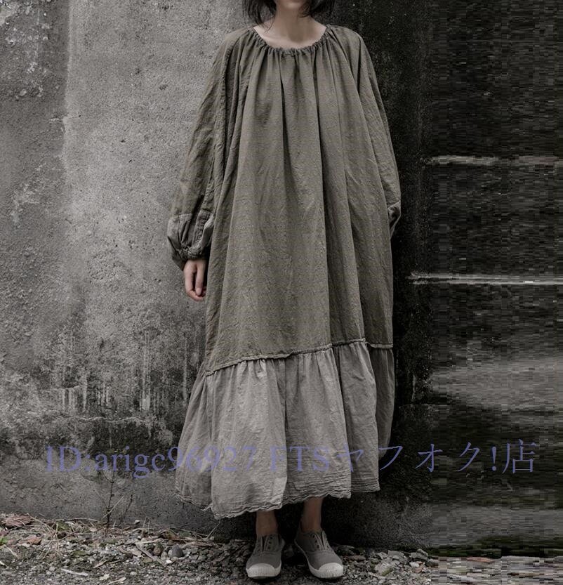 ★新品 ワンピース 長袖 ボリューム袖 体型カバー ロングワンピース きれいめ 配色柄 着やせ 綿麻 フレアワンピース 大きいサイズ ~