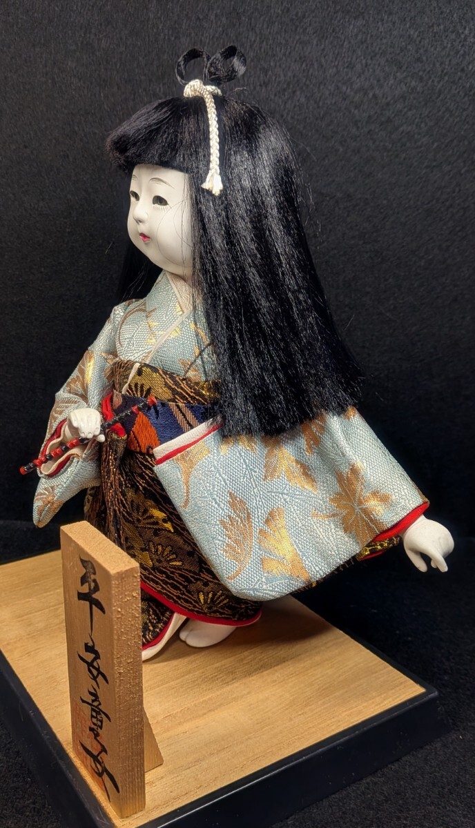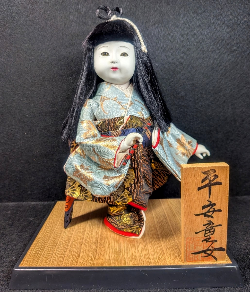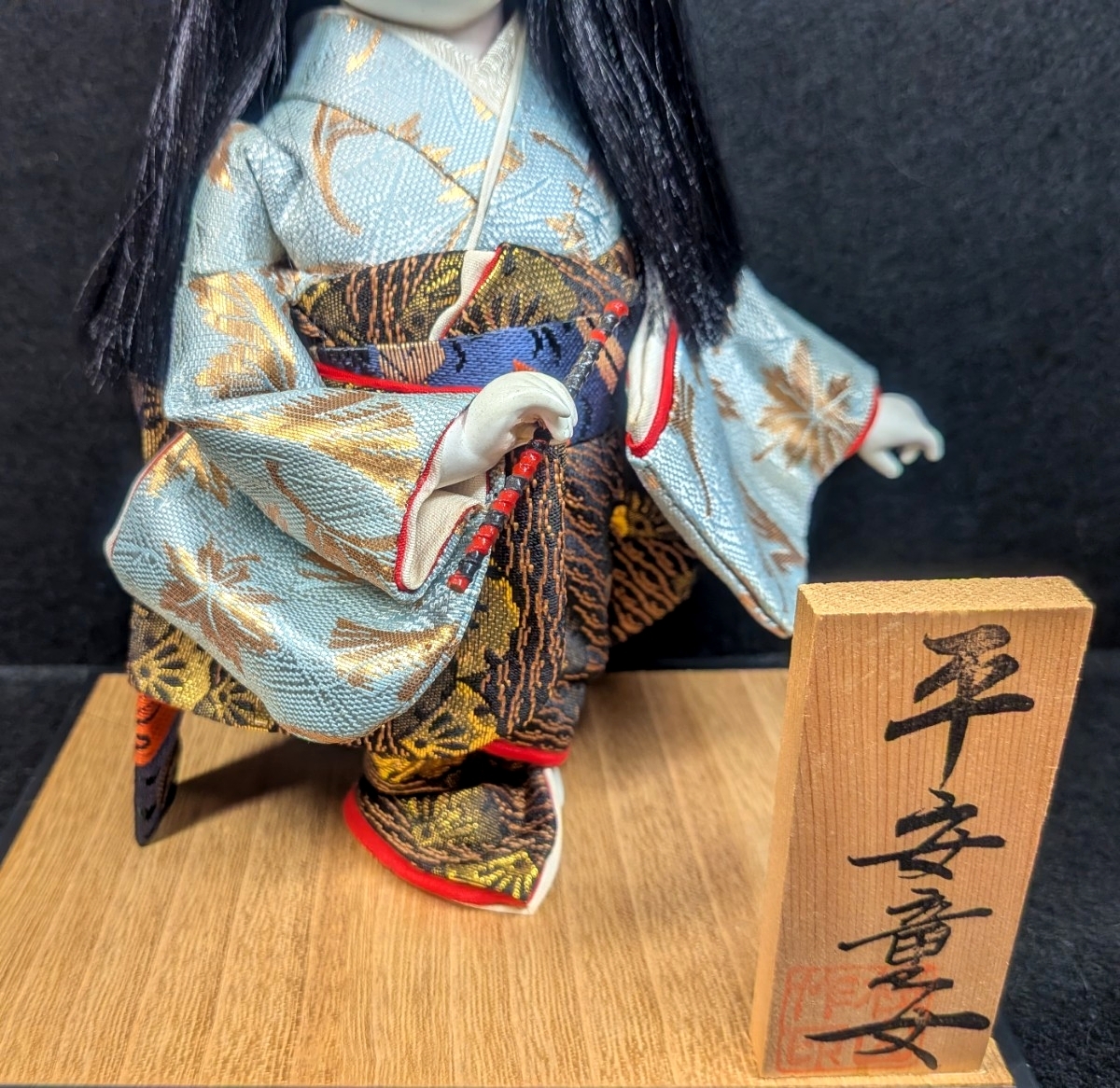 伝統的な和服を着た日本人形、黒いストレートヘアの平安童女。