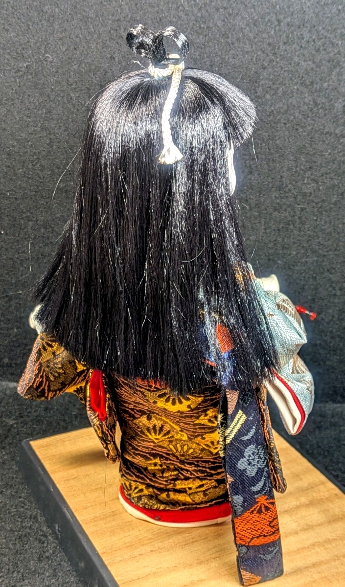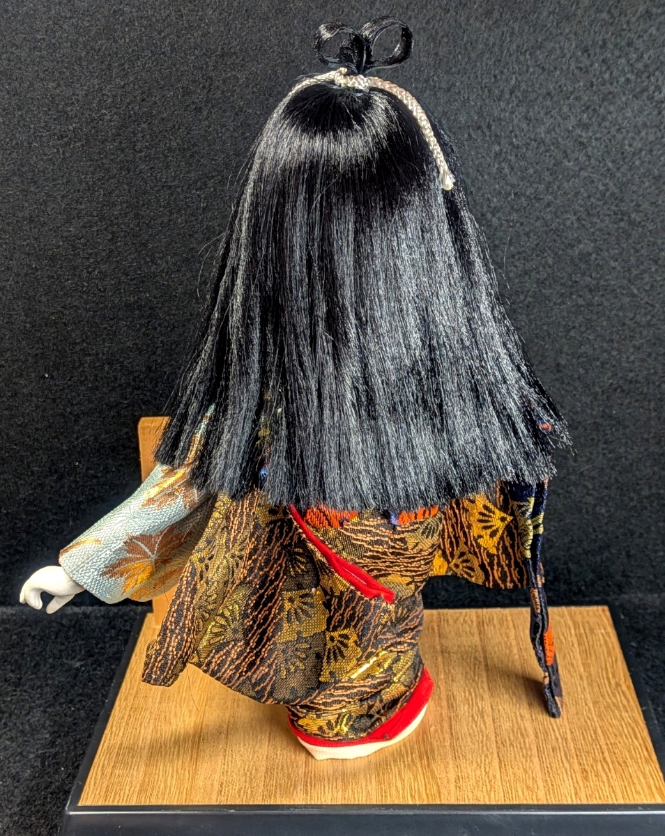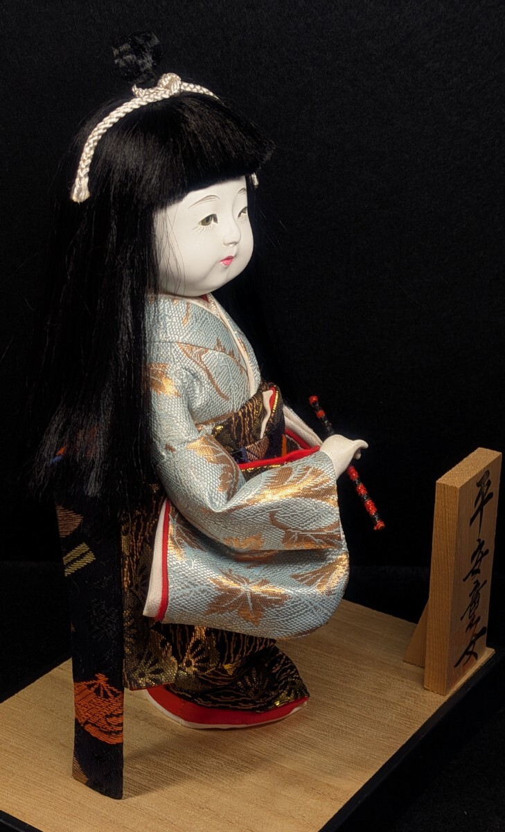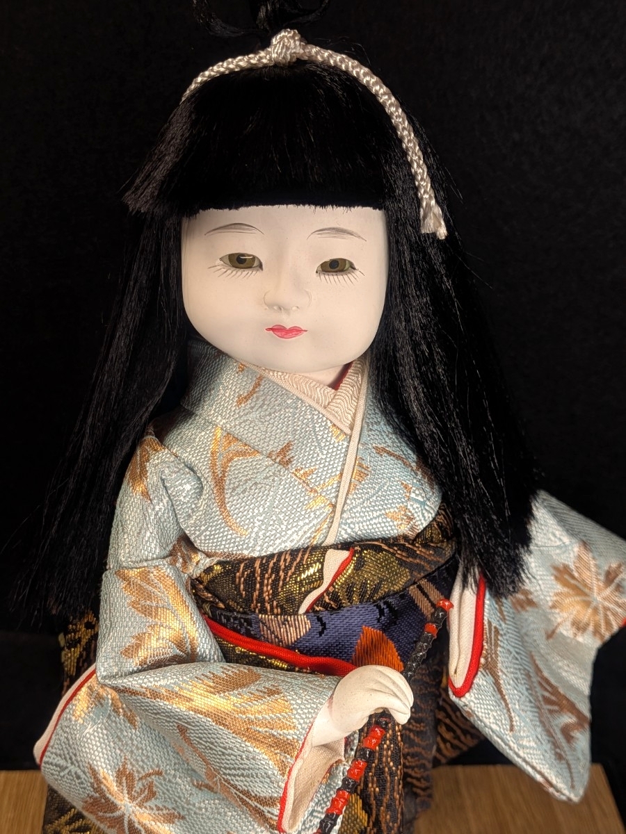 伝統的な和服を着た日本人形、黒いストレートヘアの平安童女。