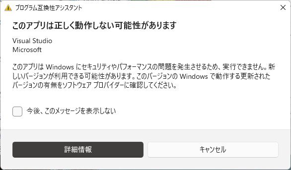 ・状態:特に大きなダメージは見られません。手持ちのPC(Windows 11)でインストーラーが起動することは確認できましたが、実際にはインストールは行っていません(画像4,5参照)。またプログラム互換性アシスタントのメッセージが表示されました(画像6参照)。正式な対応OSではありませんのであくまでも参考情報です。