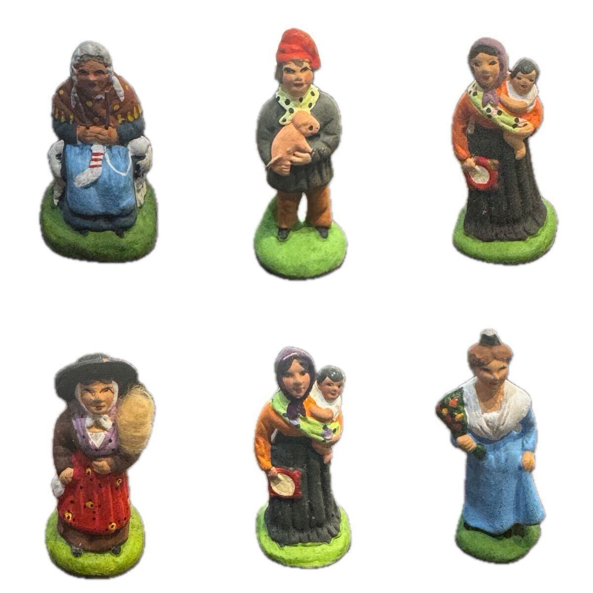 手彩色で丁寧に仕上げられた温かみのある造形で、地方衣装の男女や母子、花を持つ女性など6体セットとなります。