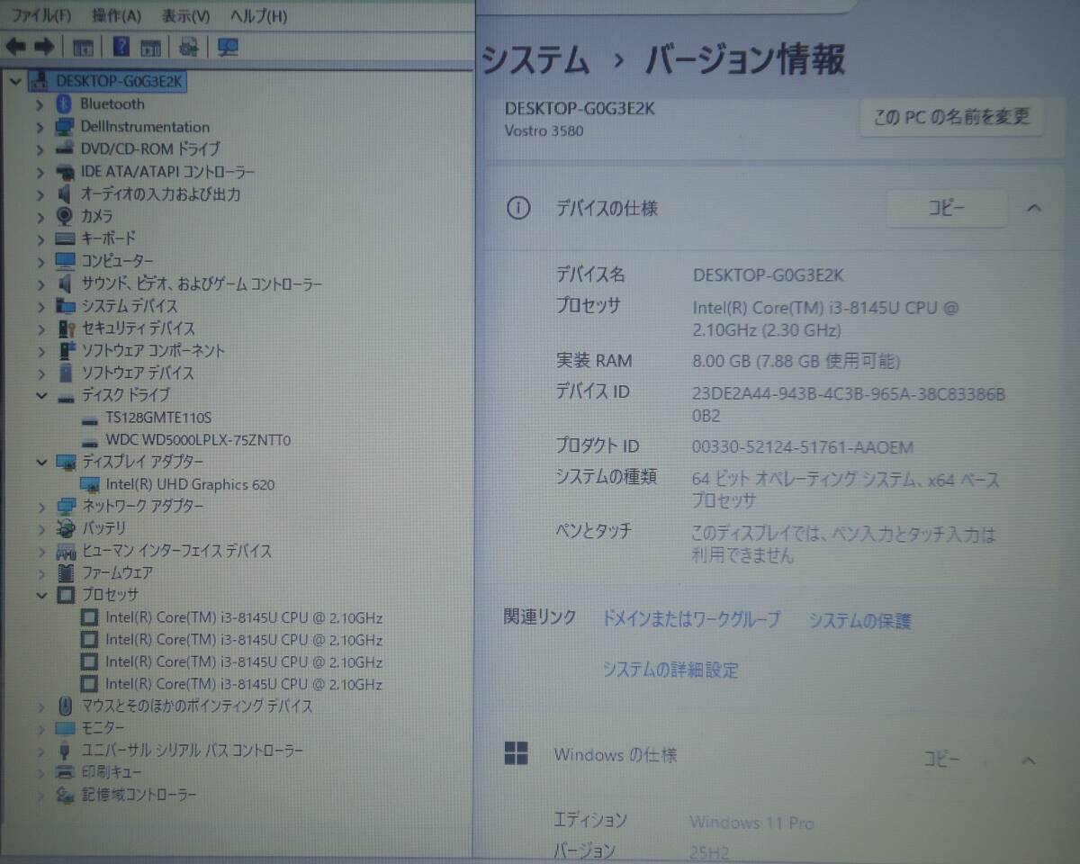 | DELL Vostro 3580 Core i3 3145U 2.1GHz M8G M.2SSD128G+HDD500G Windows11Pro | |