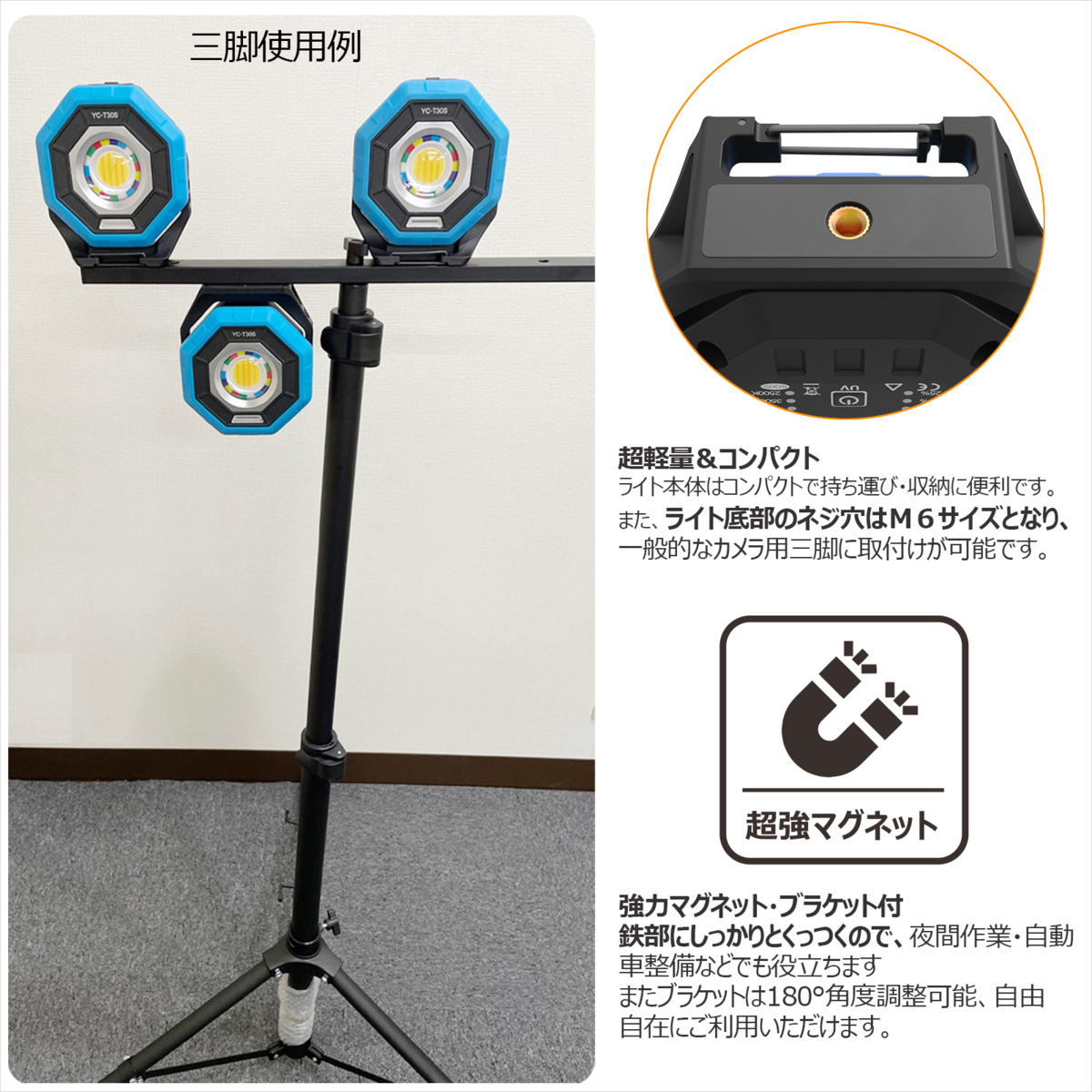 | ●超軽量&コンパクト&耐衝撃&三脚スタンドに対応可 ライト本体はコンパクトで持ち運び・収納に便利です。 ライト底部のネジ穴はM6サイズとなり、一般的なカメラ用三脚に取付けが可能です。 本体周囲を囲む青い部分はシリコン材質を採用し、万が一の落下や衝撃に耐えやすい構造になっています。 ●独自の調光調色ボタン搭載!強力マグネット・ブラケット付! 明るさ調整: 100%→75%→50%→25% 4種類。 発光色調整:2500K-3500K-4500K-6500K切り替え 4種類。 明るさ/発光色は、4段階の中からシーンに合わせ、ボタン一つで調節が可能です。 太陽光に近い昼白色や、暖かな色味の電球色など用途やお好みに合わせてお選び下さい。 強力マグネットがついているので、鉄部にしっかりとくっつきます。夜間作業・自動車整備などでも役立ちます。 ブラケットは180°角度調整可能、自由自在にご利用いただけます。 ●大容量バッテリー・USB出力可 7800mAhの大容量バッテリーを採用、わずか3~4時間の充電時間で最長13時間点灯です。 USB出力付きで、スマートフォンやタブレットなどに充電することができ、緊急時のモバイルバッテリーとしても活躍します。 充電ポートには、ほこりや水滴が入らないように保護カバーが付いています。 ●UVライト搭載(高品質398-400nm) 蛍光増白剤の有無を確認することが可能です。ベビー服や化粧品などに適用します。 釣り道具の夜光発光確認、機械のオイル漏れ点検、偽造印刷物の鑑定など、UVライトを使うことで目に見えない汚れや傷が見つけます。 カーペットなどに染み付いたペットの尿の染み汚れなどが見つけます。 蓄光素材のシールや釣り具などに蓄光を行う事も可能です。 (※ライトが肌や目に直接当たらないようにしてください。) ●多様な使い方・超便利 マグネットが内蔵されているので、金属表明に貼り付けて使用可能です。作業点検などには最高です。 鉄素材にしっかり固定でき、壁や天井や車に貼り付けたり、夜間作業、自動車整備などで十分に役立てます。 可動式のステーで、照射角度も自由自在に設置できます。 充電式・コードレスでコンセントの無い場所でも利用可能です 折りたたみ式スタンド・フック・マグネットによって、自立・壁掛け・据え置き・手持ち・紐を通して引っ掛け使用などように使えます。 ●用途 夜間作業、自動車整備、アウトドア、駐車場、倉庫照明、停電対策、災害対策、 キャンプ、夜釣り、山登り、散歩、夜間警備、護身用時に大活躍しています。 |