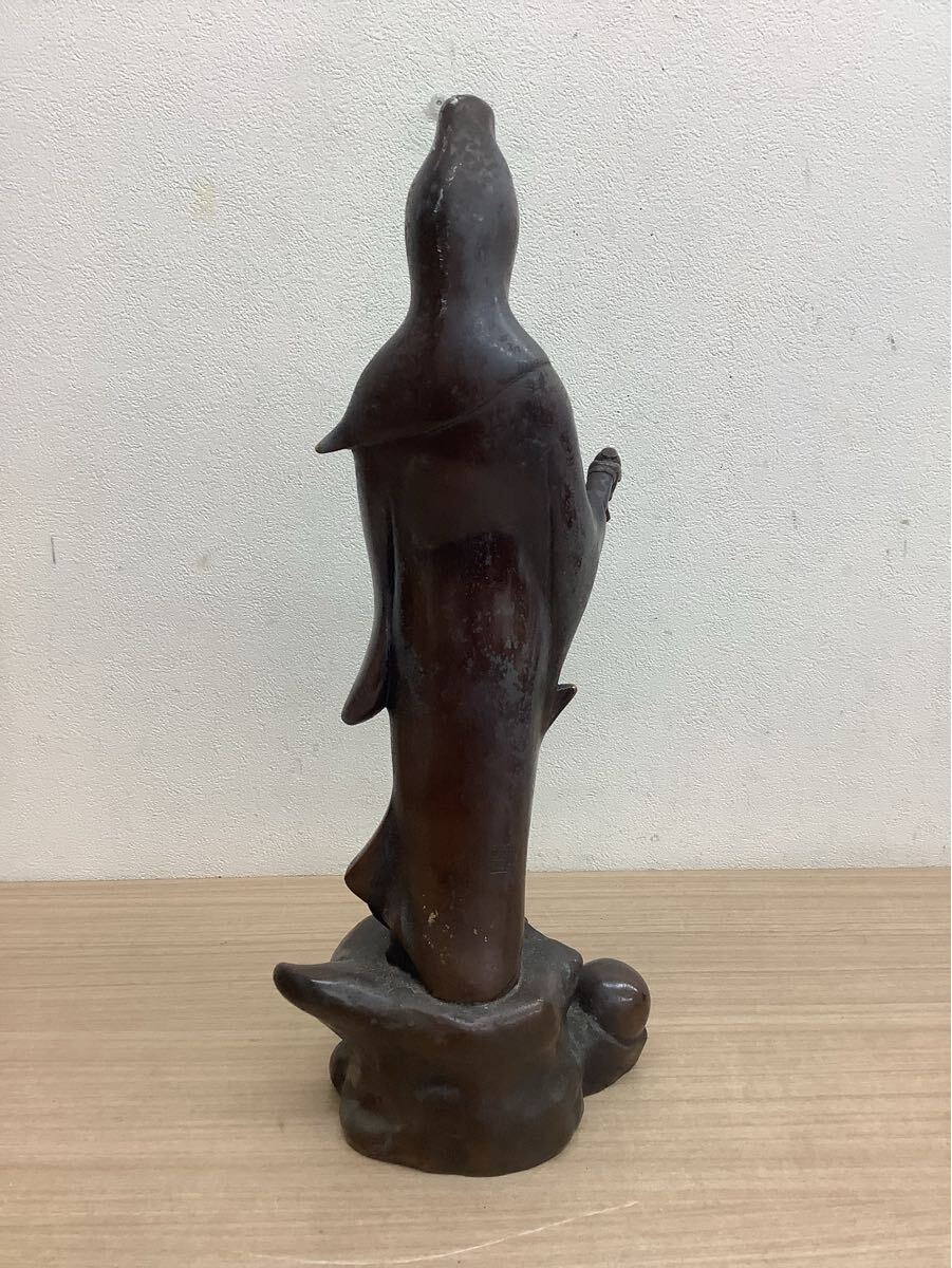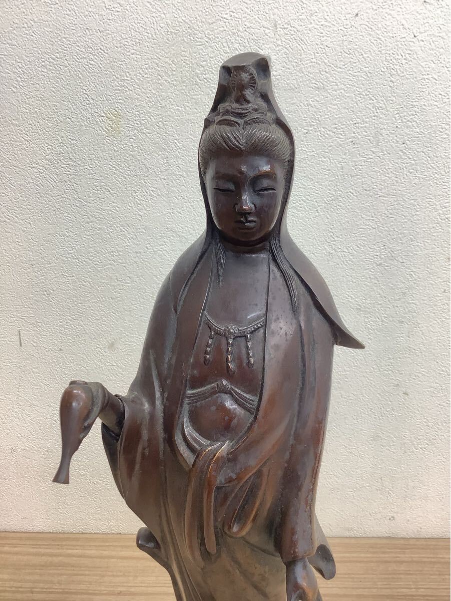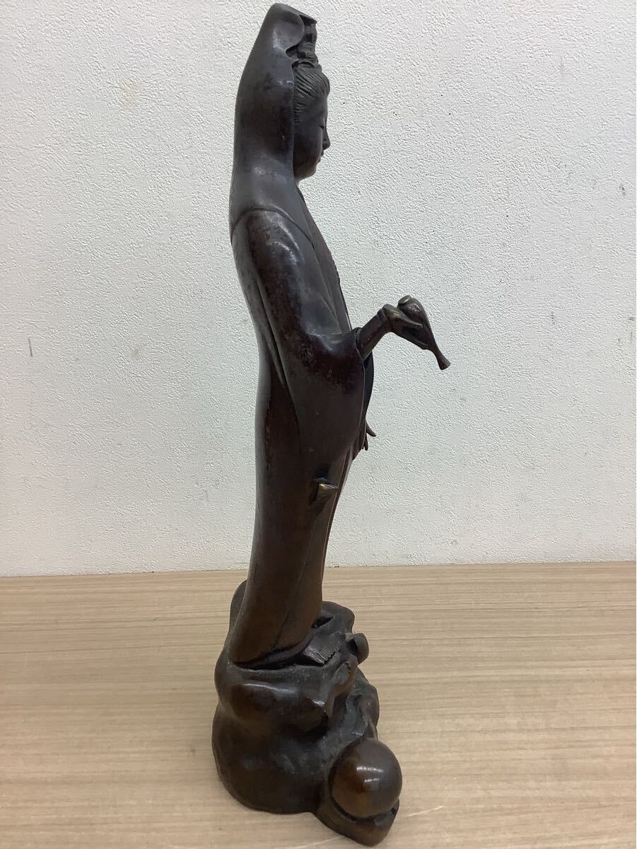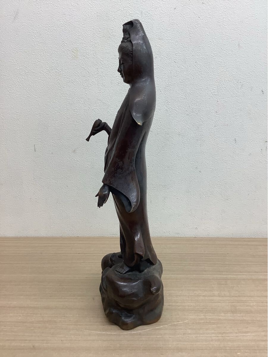 観音菩薩像 金属製 立像 彫刻 在銘有 仏教美術 アンティーク 台座付き 高さ約47cm 現状品