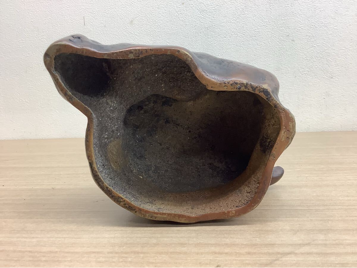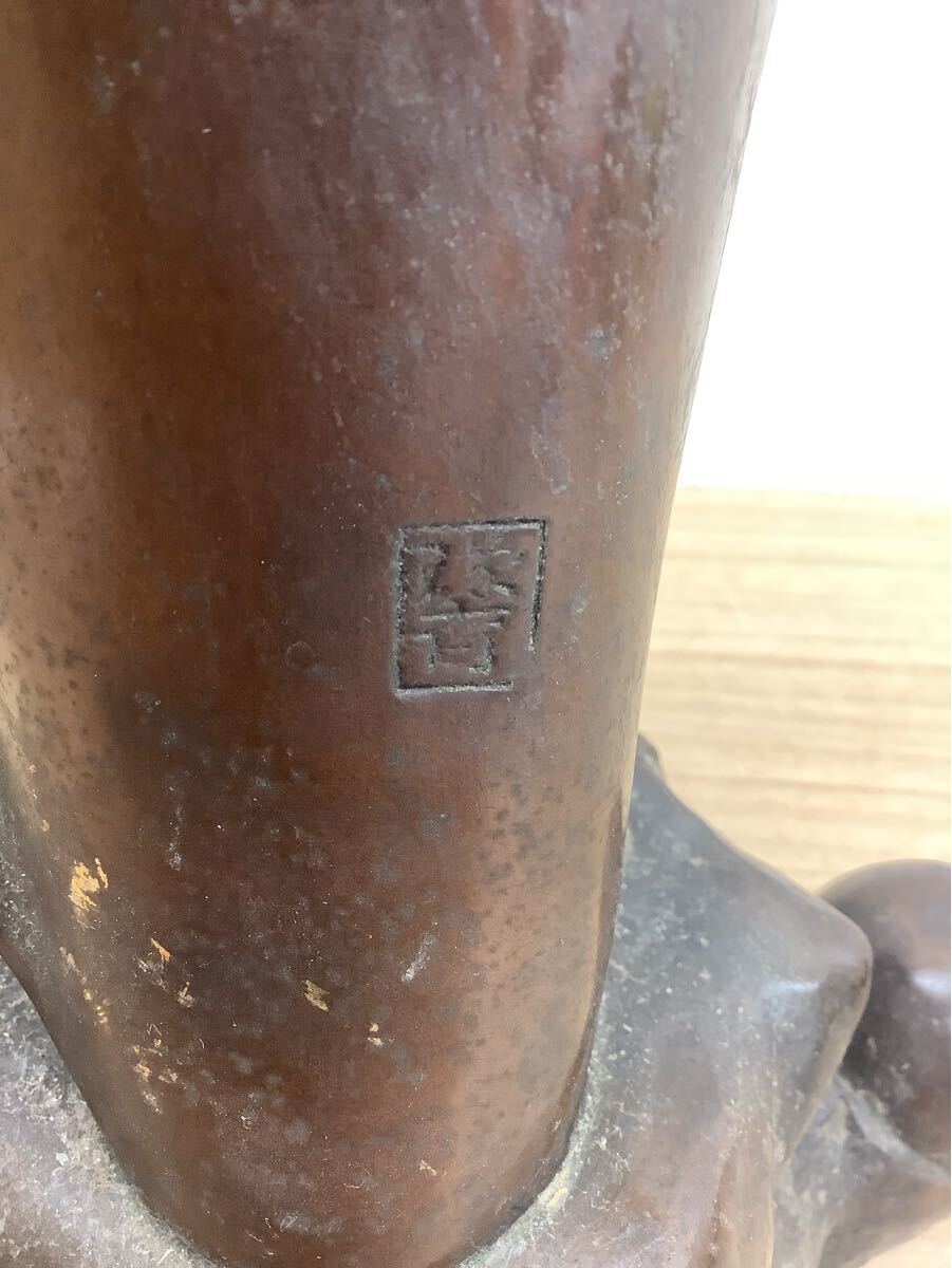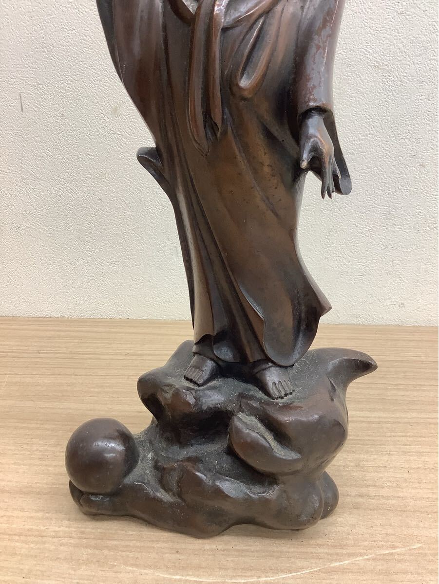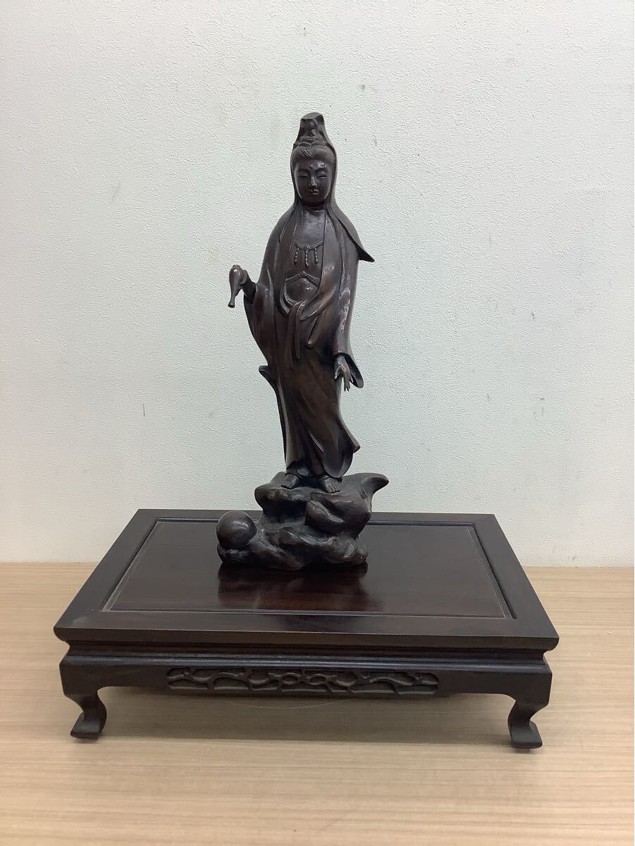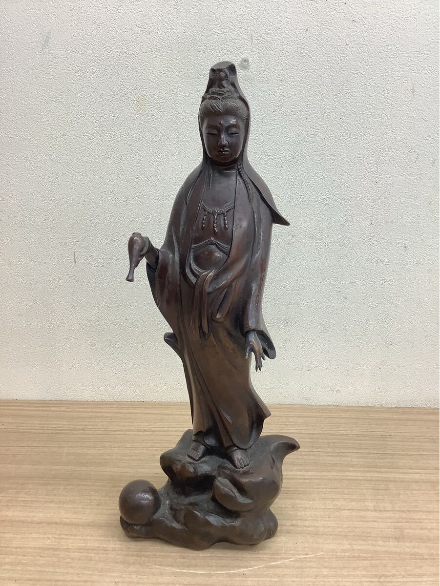 観音菩薩像 金属製 立像 彫刻 在銘有 仏教美術 アンティーク 台座付き 高さ約47cm 現状品