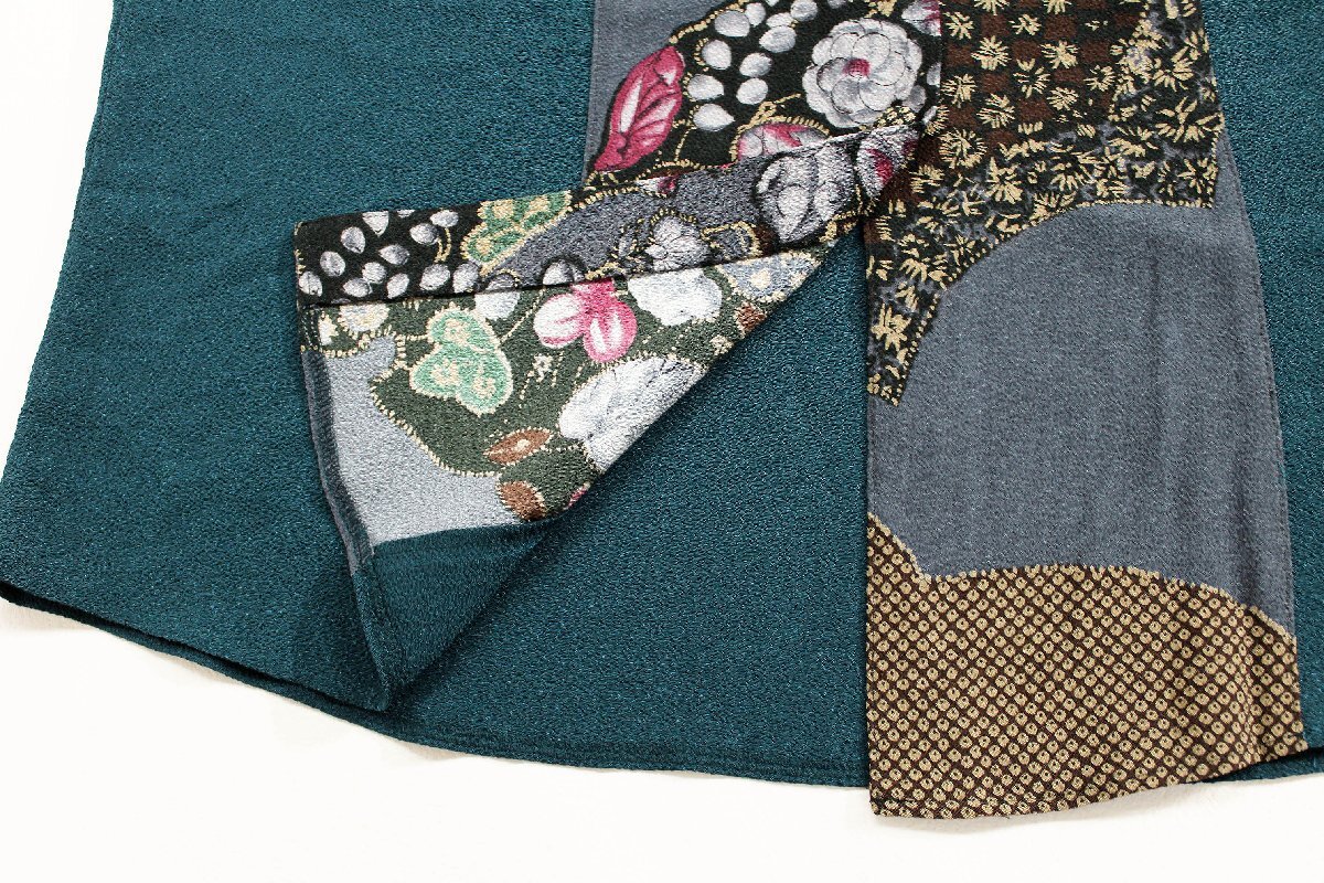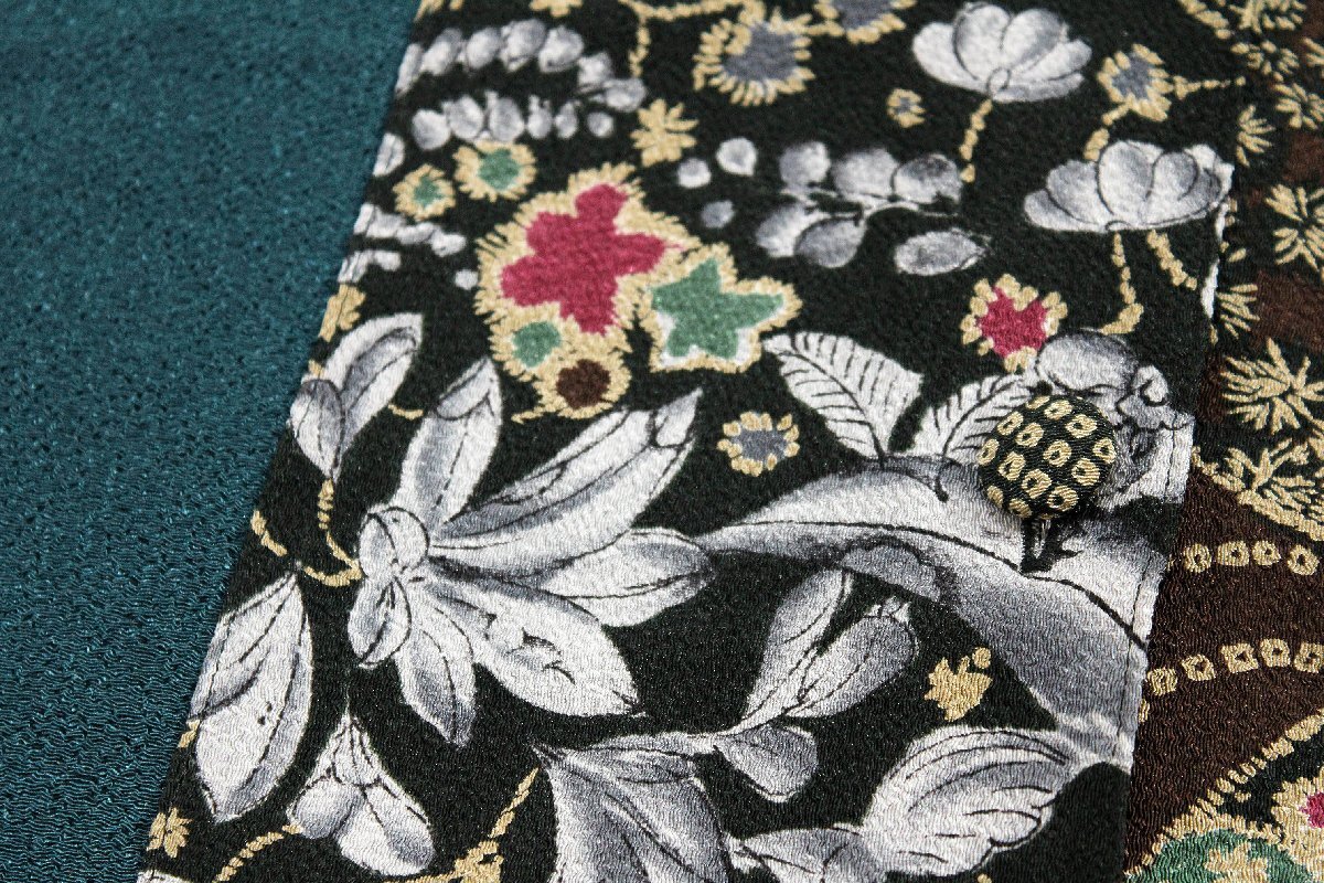 濃い青緑色の無地×和花柄プリントが切り替えられたデザインです。